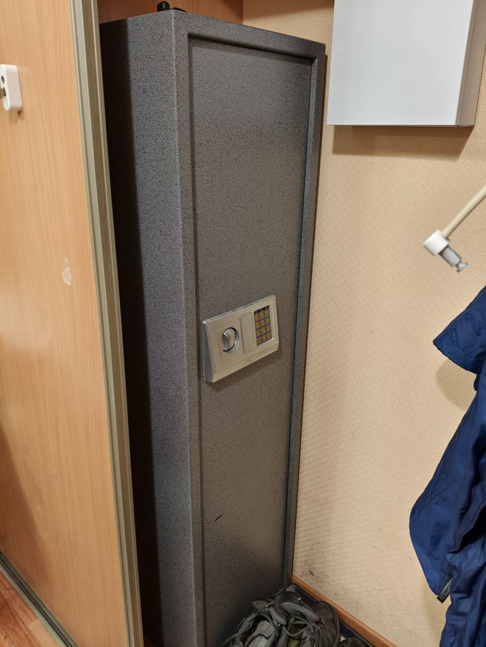 2. Сейф оружейный, код, мех замки. 1,5 метра, 5 стволов + патронник-пистолетник, 3 полочки. Сталь с порошковой серой окраской. - 5 500, торг.