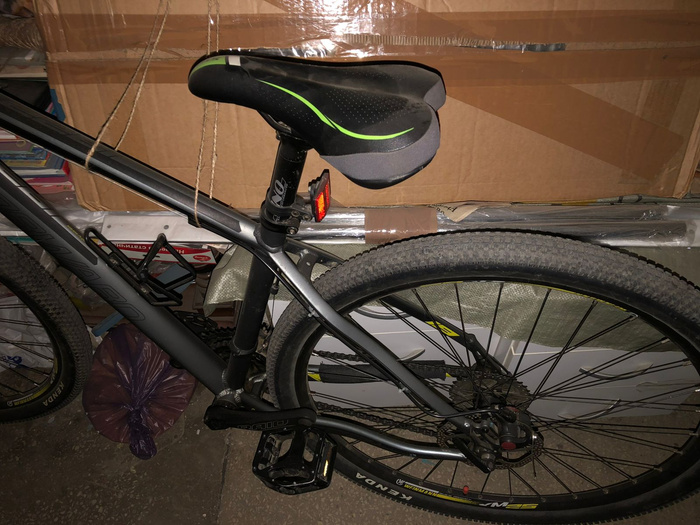 Особые примечания: цвет черный с зелёной полосой выгорел на солнце, вилка передняя с ржавчиной, и подтёками масла, грязные крылья, покрышка Kenda Klondike зима, седло Calypso. Много стяжек которые фиксируют оплётку переключения скоростей. Грипсы с металлическими обоймами синего цвета.