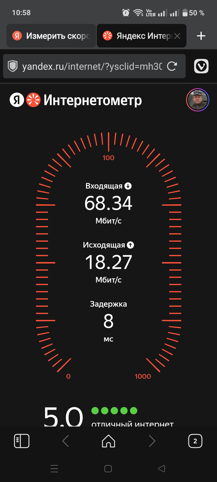 Замерил на втором телефоне, который принимает интернет.