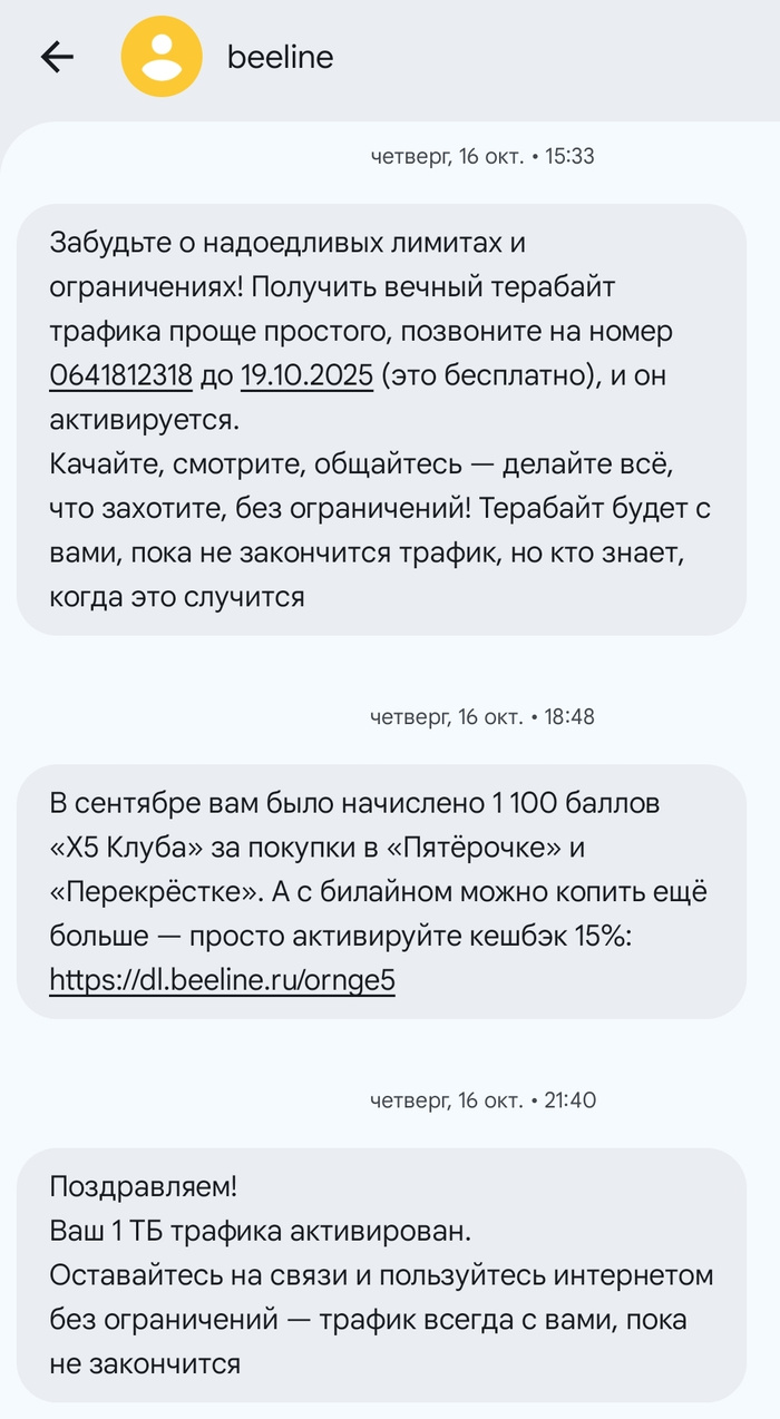 У меня такая ж ерунда.Дали на почти законсервированную билайновскую СИМку Безлимитку пожизненно.Свят свят.если переживу эту Халявку,то ещё отпишусь