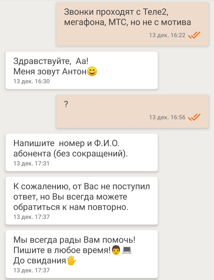 приложении авторизована сим-карта мотива), указал всё в одном сообщении. Сначала живого человека подключали около получаса, потом он написал "здравствуйте..." потом ещё через полчаса от оператора пришло "укажите ФИО и паспортные данные абонента" (при том что в приложении всё авторизовано, а