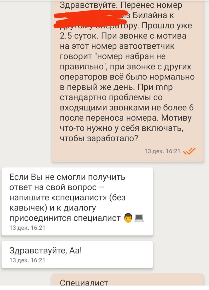 Не мог не поделиться. Перенес номер от одного оператора к другому. Теперь при попытке позвонить на этот номер с мотива роботетка говорит что номер не существует. Уже неделю. Со всех остальных операторов звонки стали проходить в тот же день. Мотив, вы чего?? Написал им в чат из приложения (в