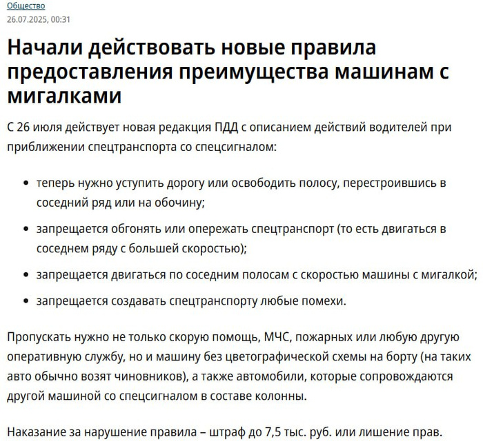 С 26 июля водители обязаны не просто уступать, а освобождать полосу для кортежей и машин с мигалками — вплоть до съезда на обочину.