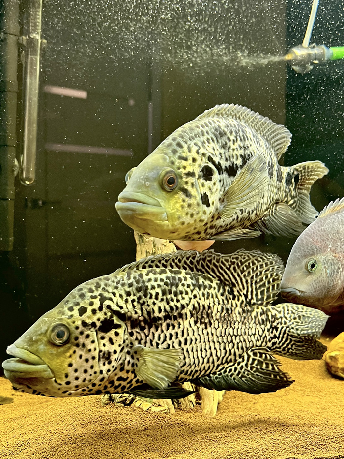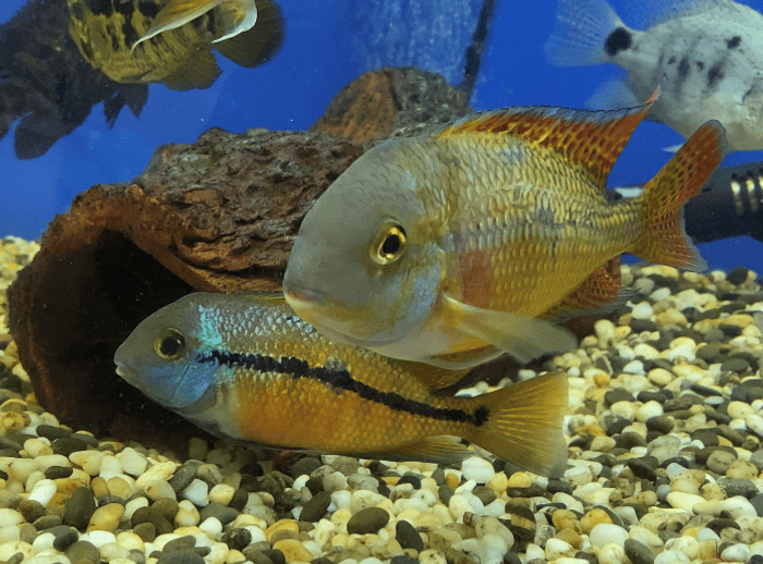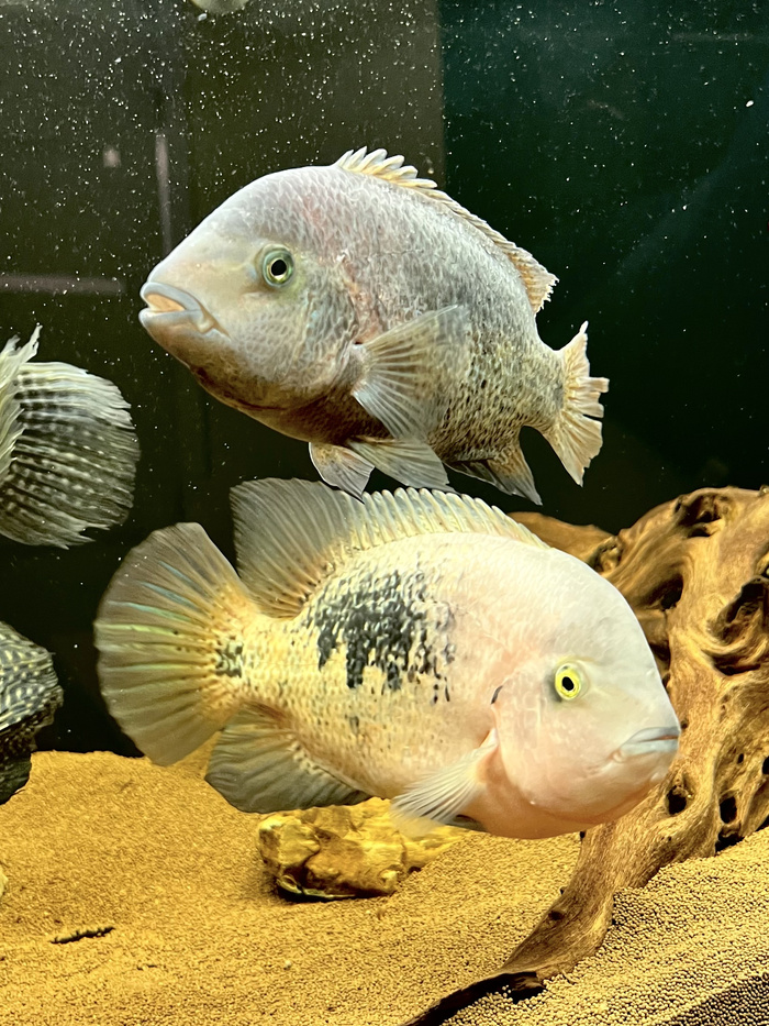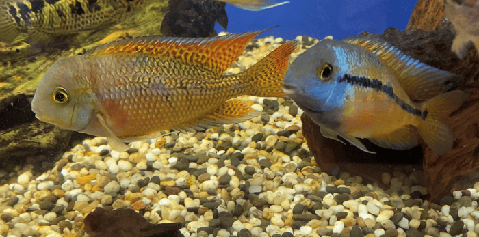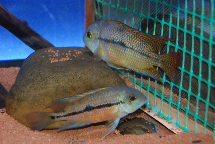 Второй день на новом месте. Деятельные рыбёхи, изучили территорию и стали готовить гнездо. Видимо, немного стрессуют. Заказал им грот для укрытия.