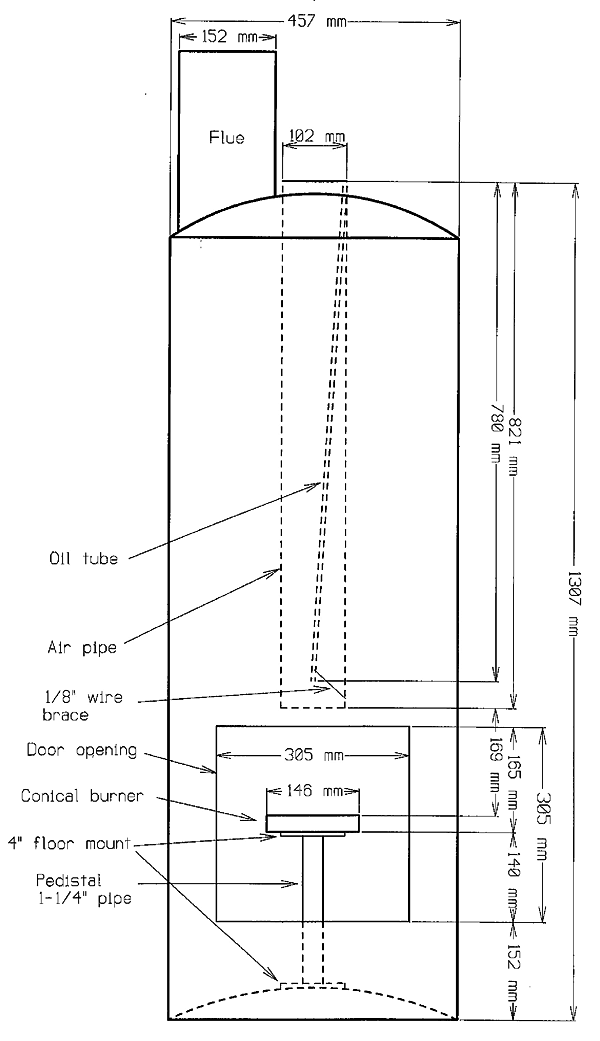 у себя не нашел. Вот ссылка на чертеж. Принцип оч простой. Подогретое масло капает на раскаленный металлический блин, моментально испаряется, а пары воспламеняются.возжух сосет сверху через трубу Д102, желательно тоже подогретый от дымохода. масло, истекая из бака через тонкую трубку, обвитую для подогрева вокруг дымохода, капает по центру той же трубы. расход масла регулируется краником.