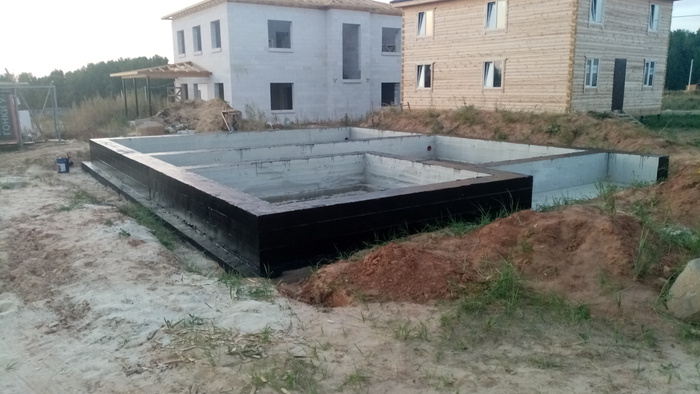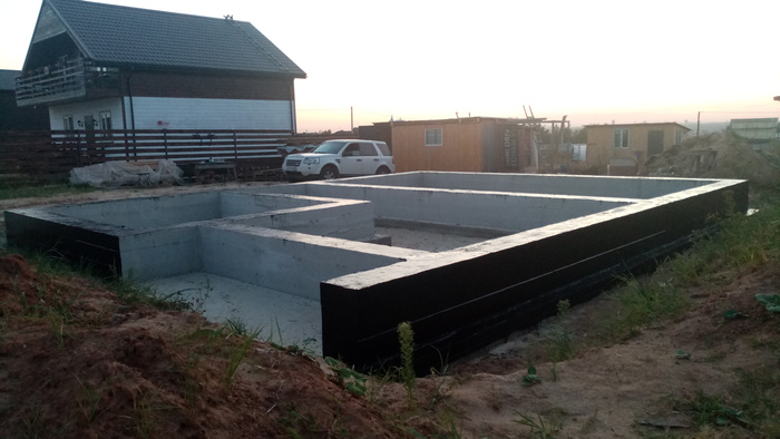 После заливки подошвы 800*200, установили арматуру и опалубку и залили фундамент. А далее я самостоятельно произвел огрунтовку и гидроизоляцию