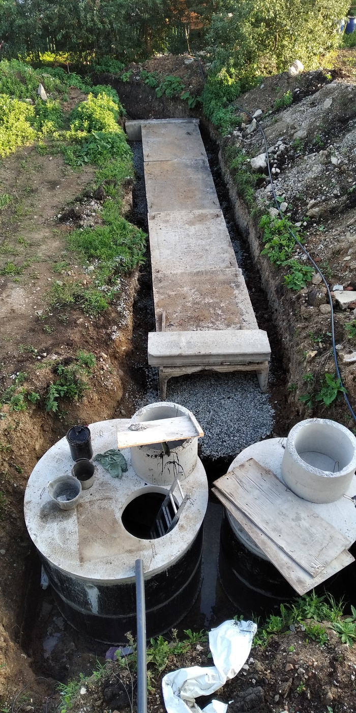 А это так, заодним фотка попалась. Канализация из за которой получился лютый перерасход на земляных и Монтажных работах, впридачу в июле подговнила погода и кран не мог заехать на участок