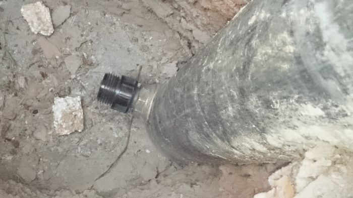 7. Адаптер. Находится на глубине 2 метра. От него идет труба в дом. Перемычка в адаптере между рабочей трубой и "ключом" ( резьба для привинчивания приспособления для вытаскивания-установки адаптера на ствол скважины) просверлена большим диаметром для присоединения уличных кранов.