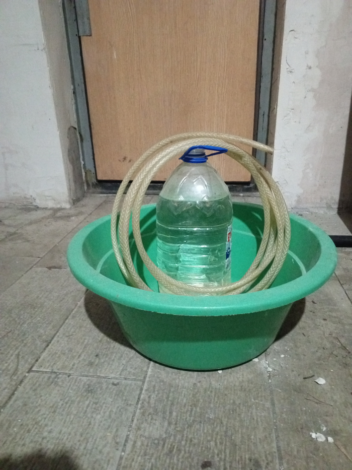 Открытый конец трубки опущен в таз. Плотно заткнутый второй конец трубки поднят на 1метр над уровнем таза.