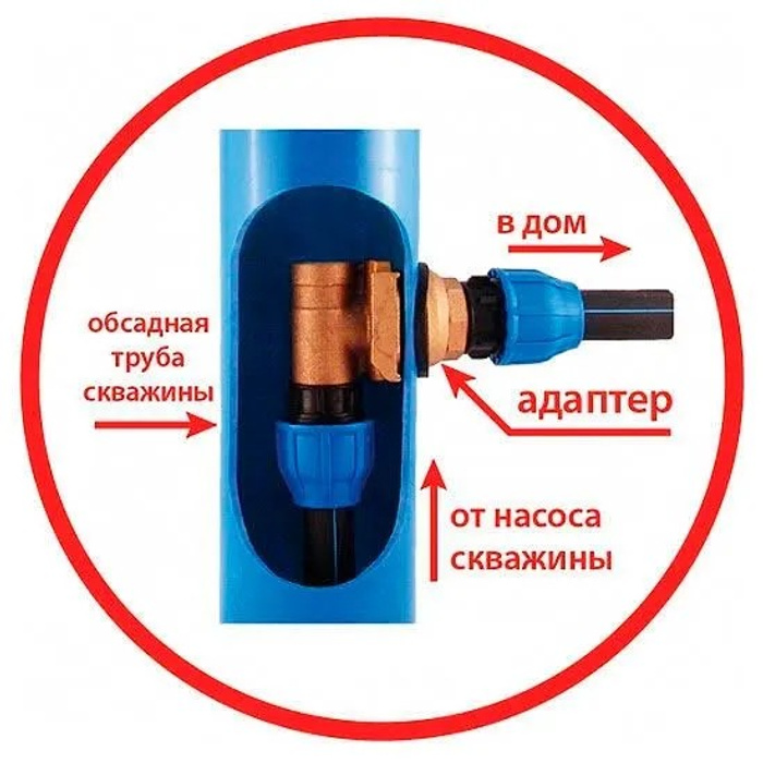 Адаптер - устройство, на котором подвешен насос (за ПНД-трубу) и оно (устройство) через отверстие в обсадной трубе скважины направляет поток воды в дом.