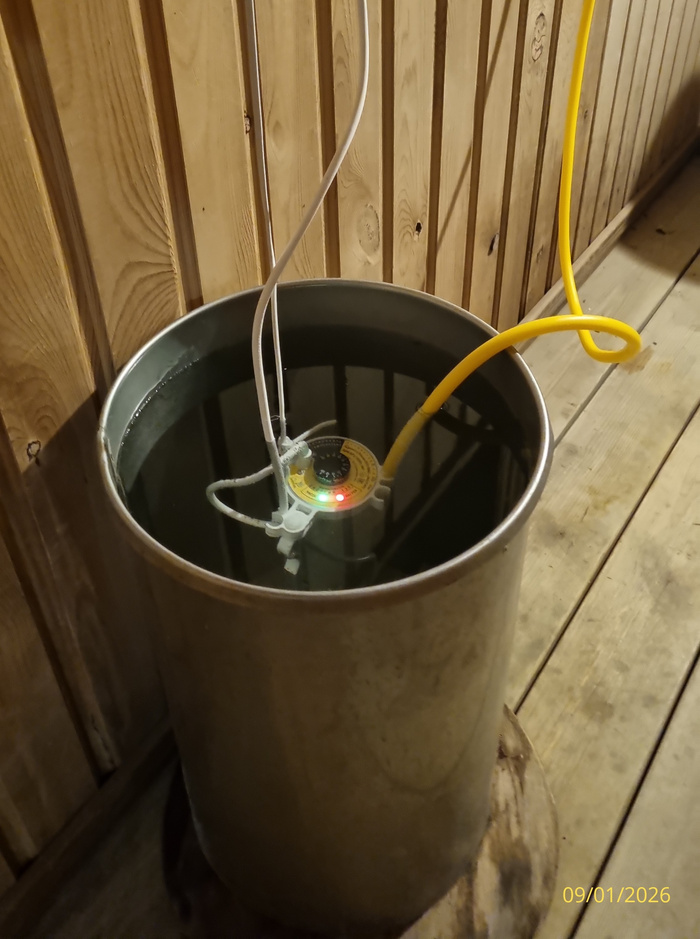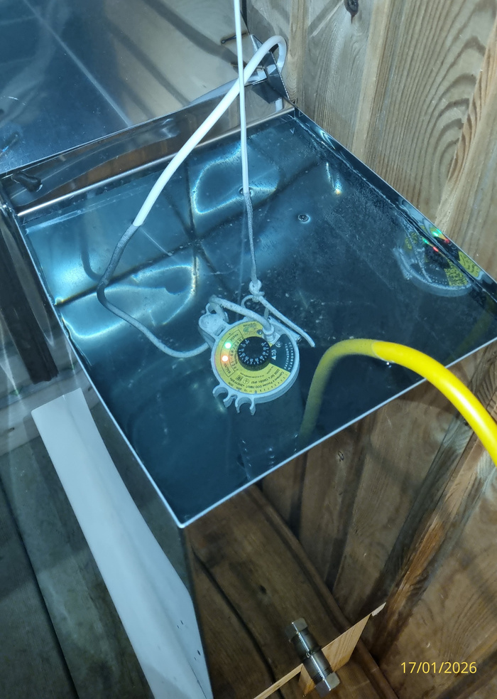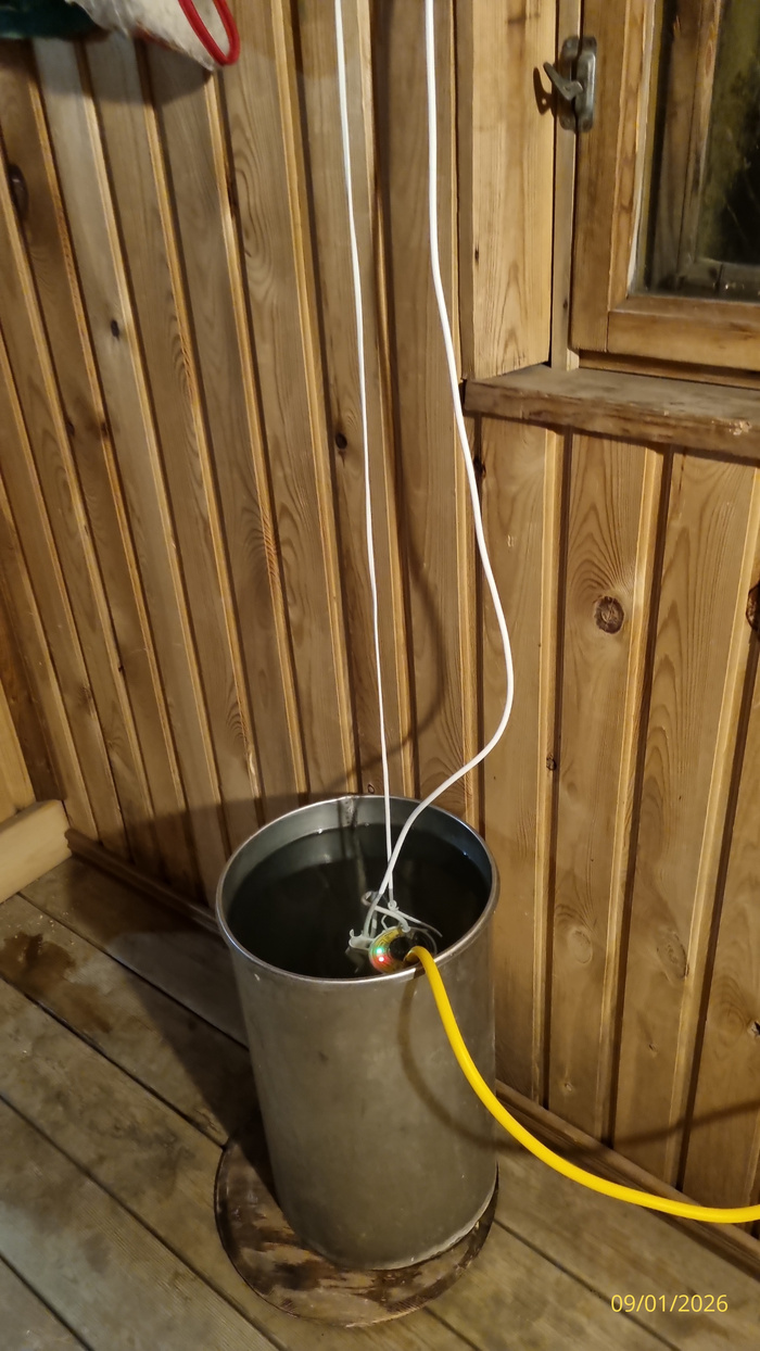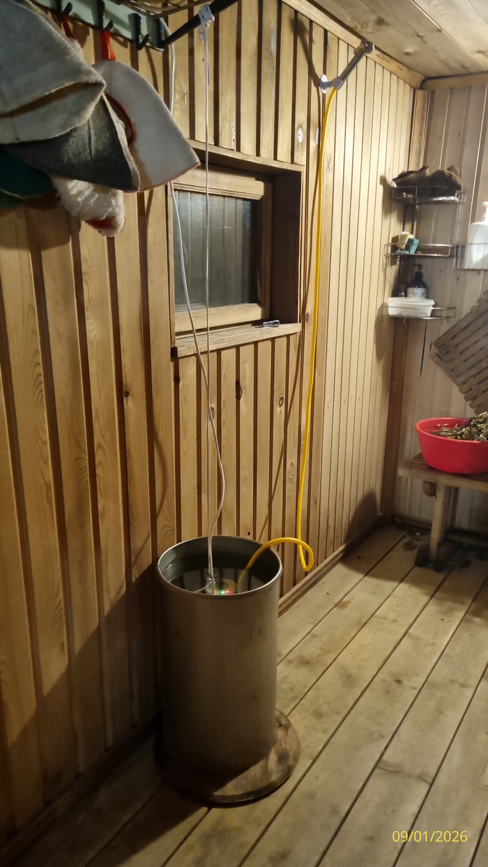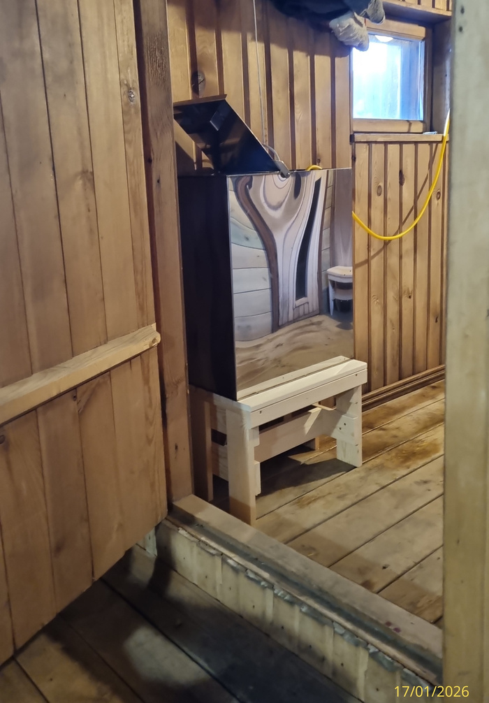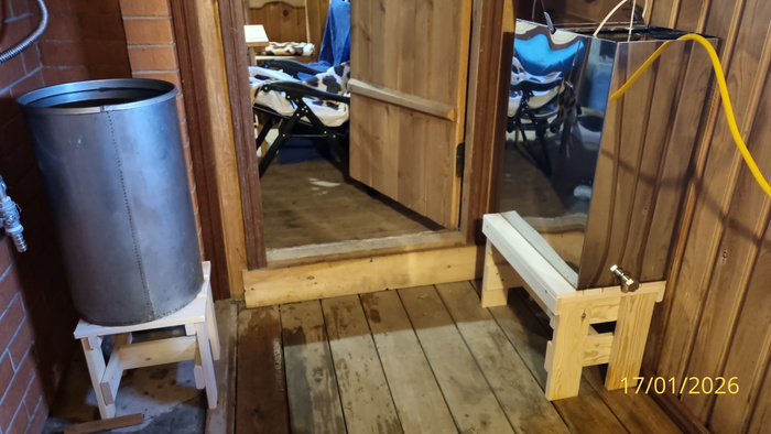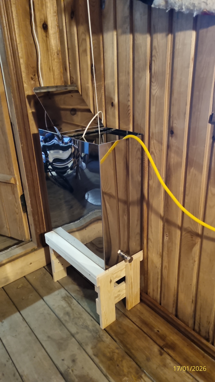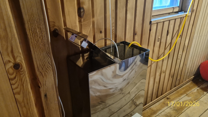 В связи с наступлением зимы и приближением морозов поднялся вопрос о сохранении от размораживания теплообменника. Этот резервуар с двухмиллиметровыми стенками из нержавейки находится внутри печки и, в случае повреждения, замена довольно проблематична. Один вариант - просто полностью сливать воду и второй- сделать температуру внутри выше 0 градусов. Решил использовать оба. Посему в парилке, под лавкой, ближе к полу, установил 800вт обогреватель с терморегулятором температуры окружающего воздуха. Ранее, в сильные морозы вода в баках замерзала, даже один бак даже пришлось убрать, лопнул. Поэкспериментируем. В сильный мороз можно и слить воду полностью, на а так посмотрим. Вчера замерил температуру вокруг терморегулятора во время топки. +23. В самой парилке + 85. Вполне нормально.