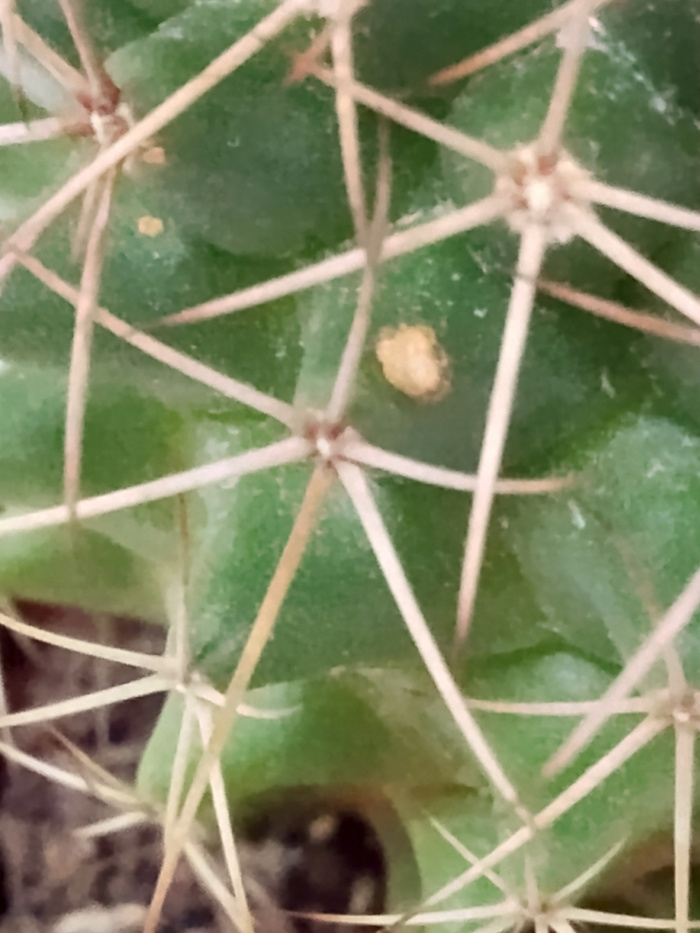 Здравствуйте!Я буквально на днях купил кактус, и меня слегка напрегает появление этого пятнышка, не далеко есть еще одно такое же. Плюсом по какой то причине иголки кверху темные, но возможно он плосто покрашеный из магазина был. Подскажите, что это может быть? Кактус Маммиллярия.