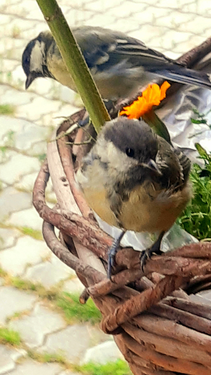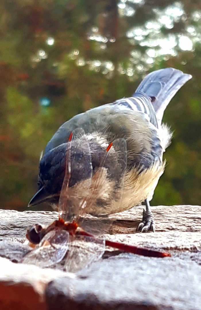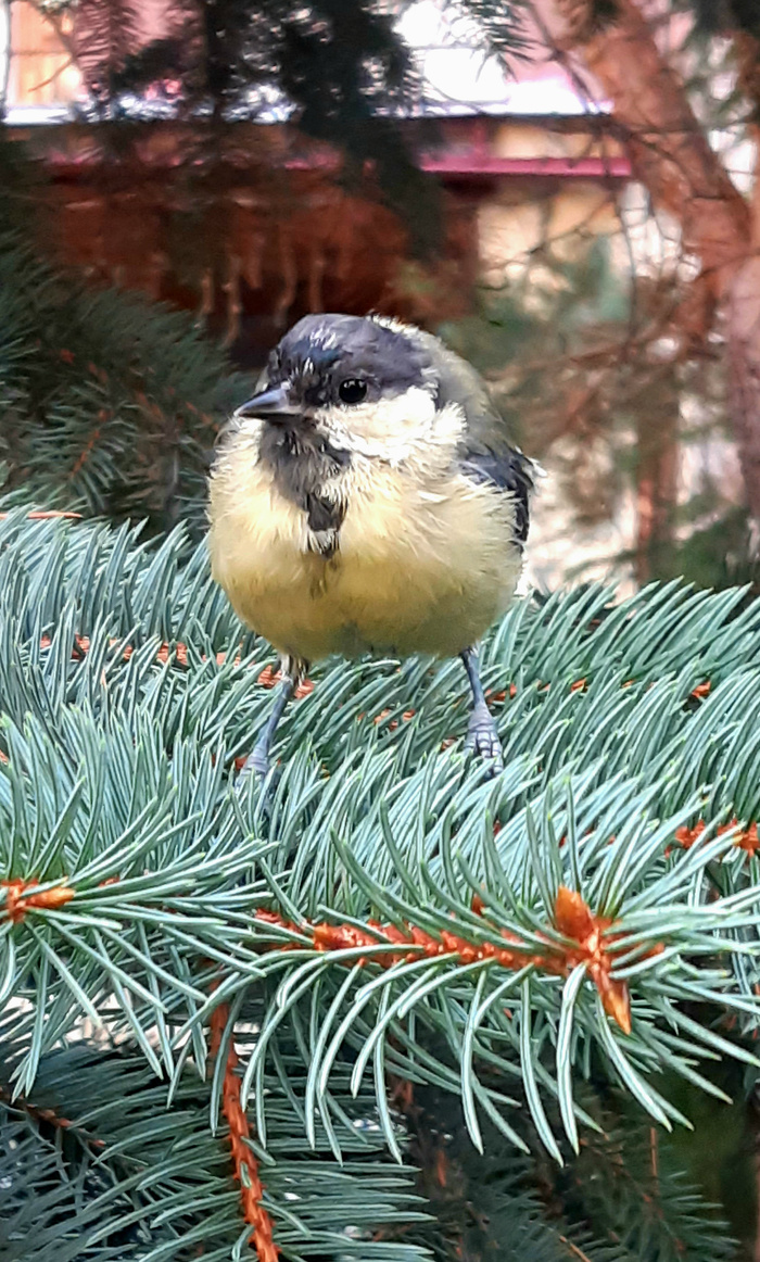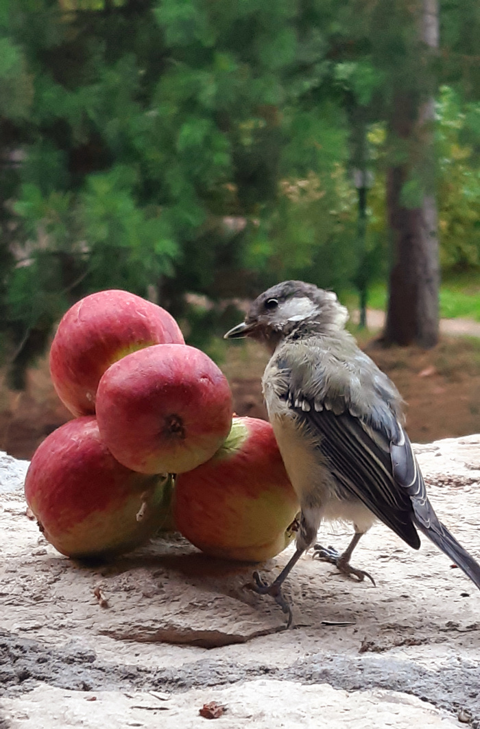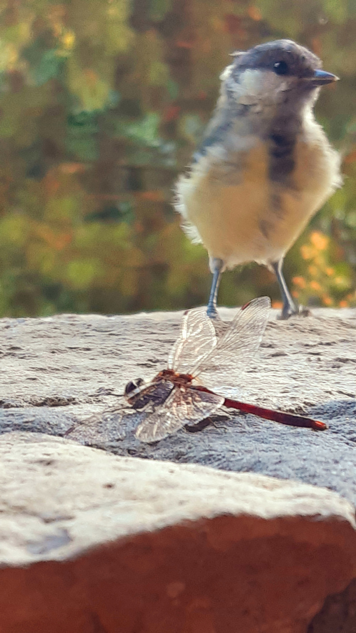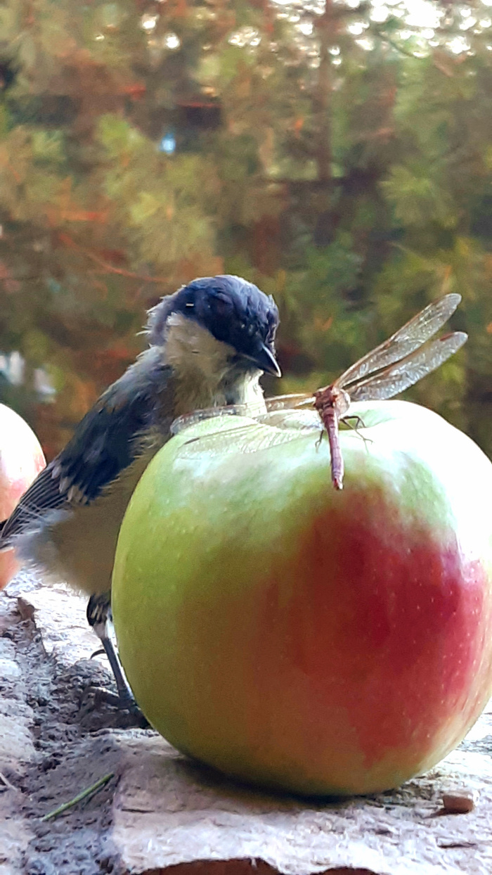 С каким любопытством синичка изучает неведомое крылатое существо...