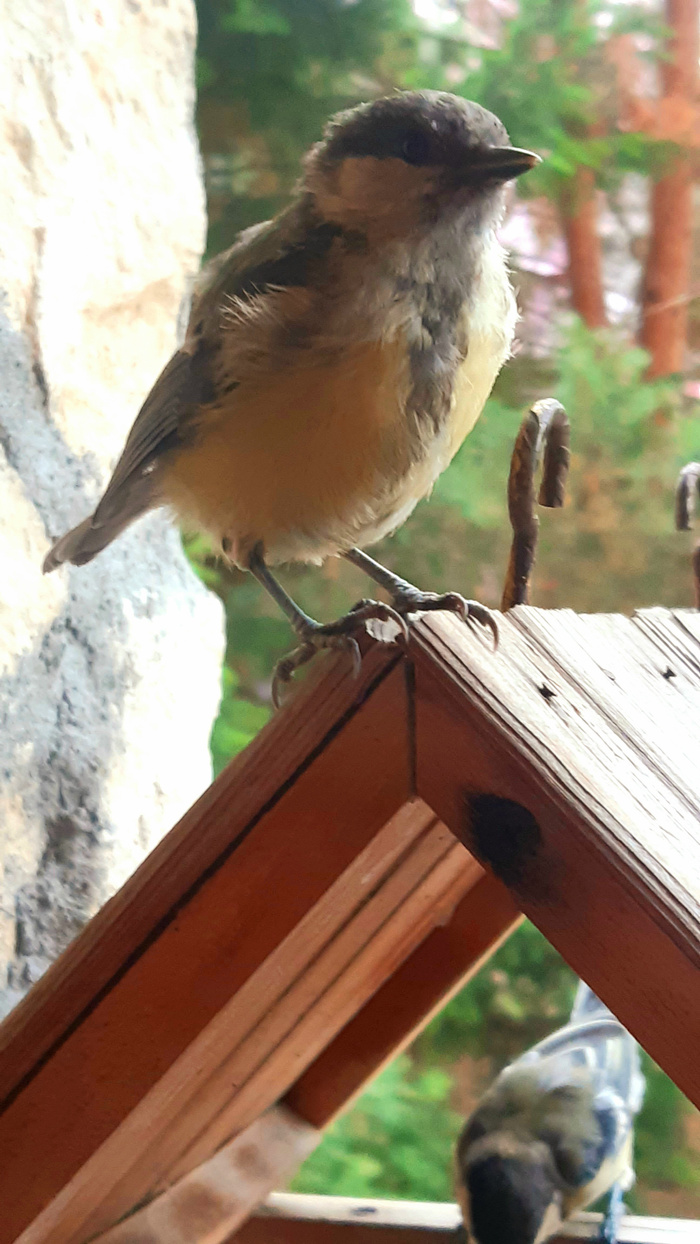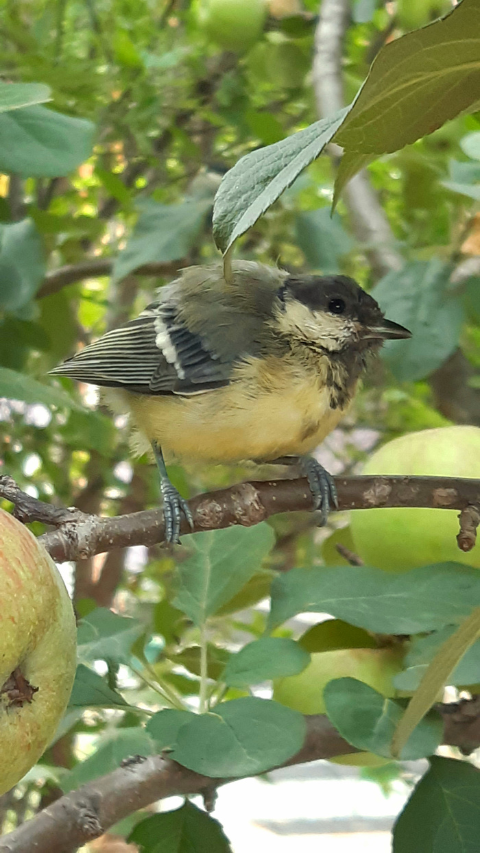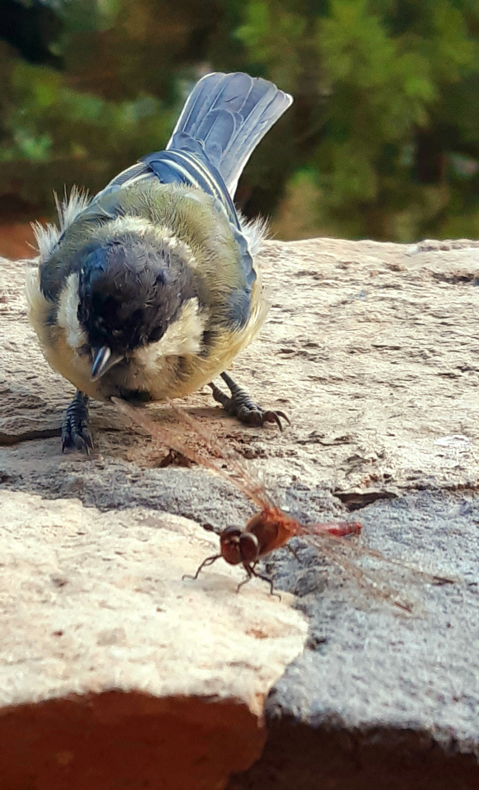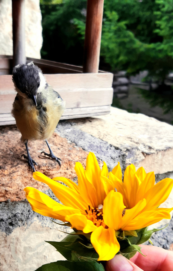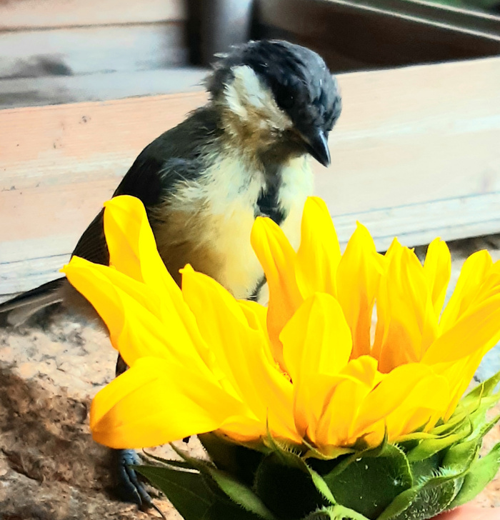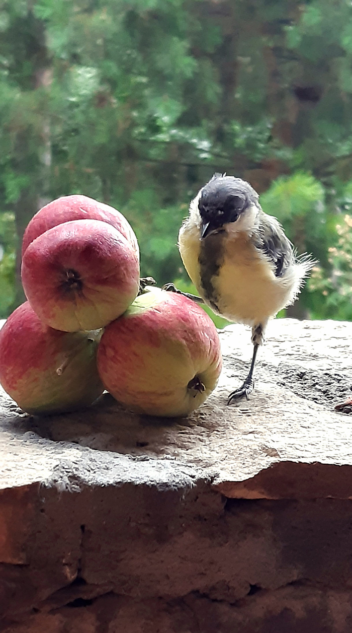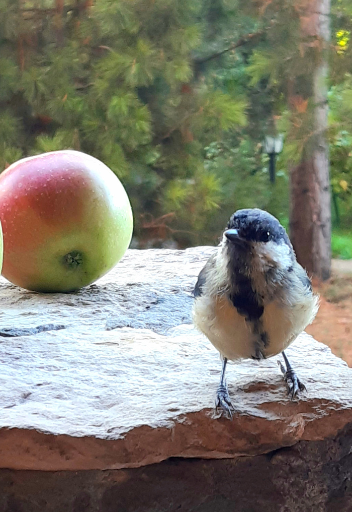 С каким любопытством синичка изучает неведомое крылатое существо...