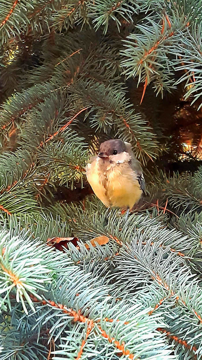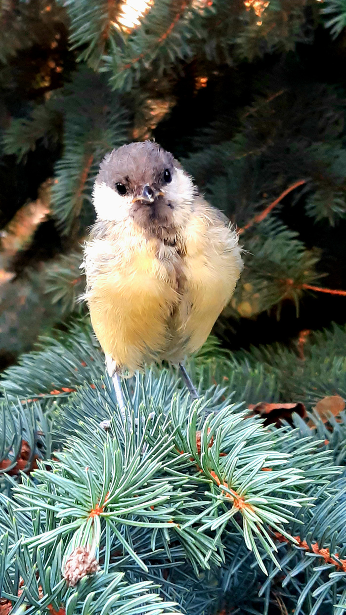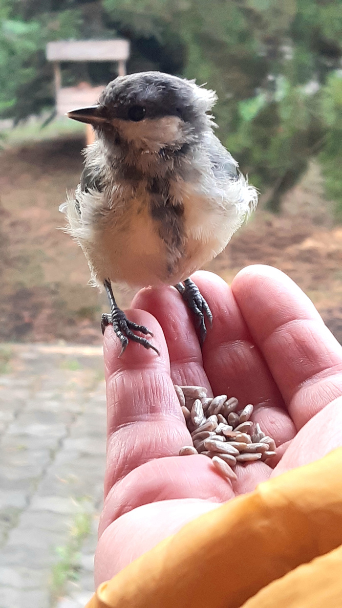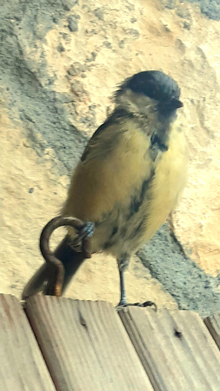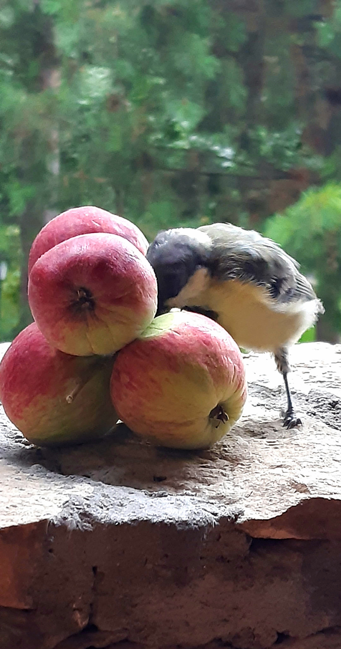 С каким любопытством синичка изучает неведомое крылатое существо...