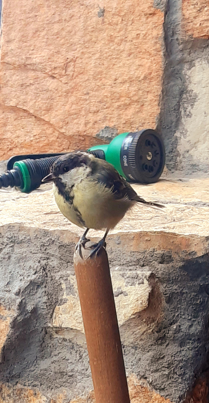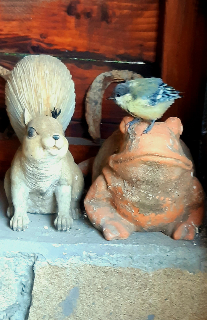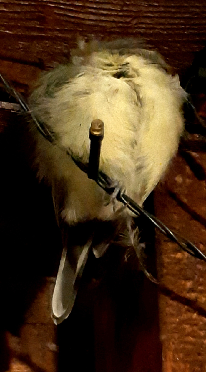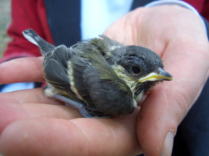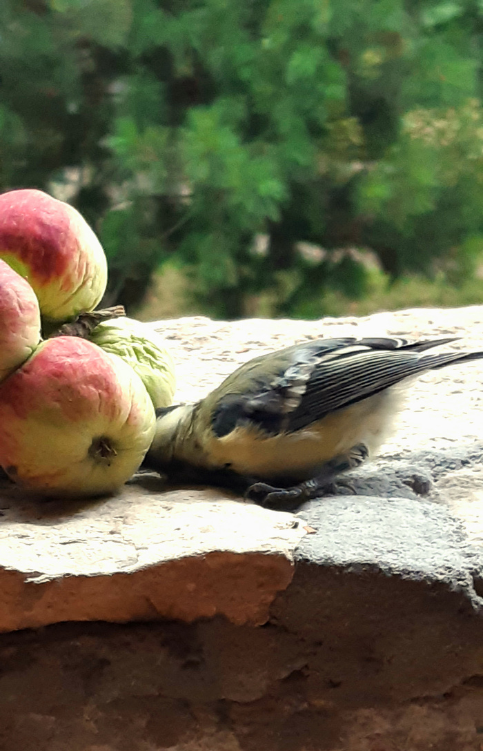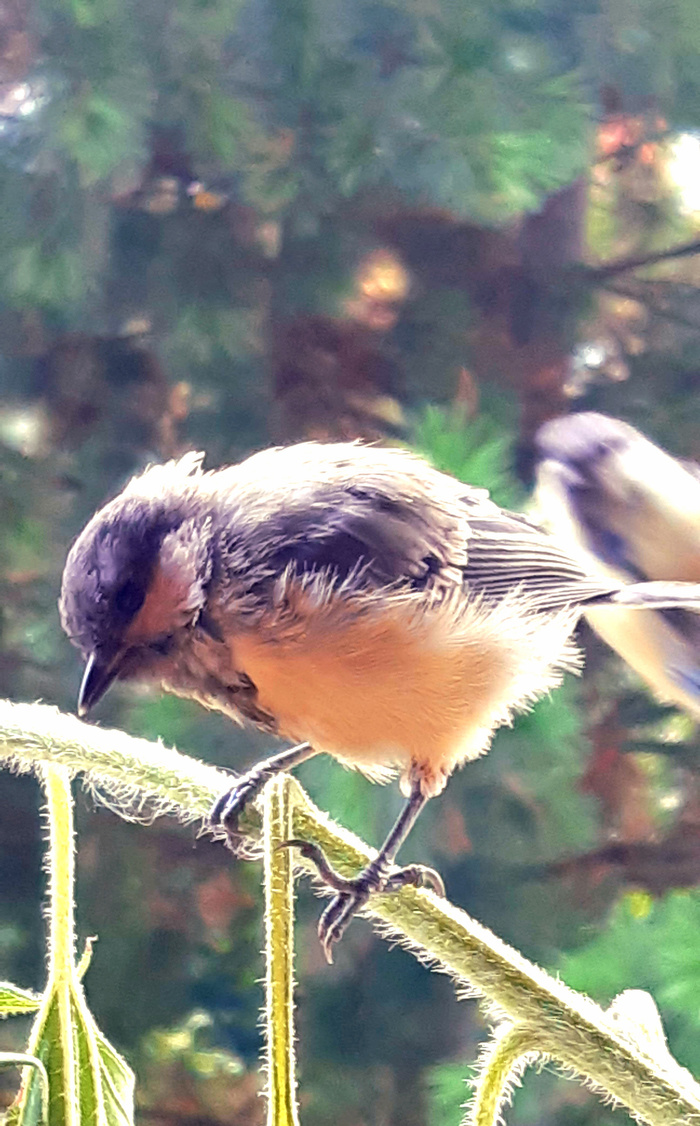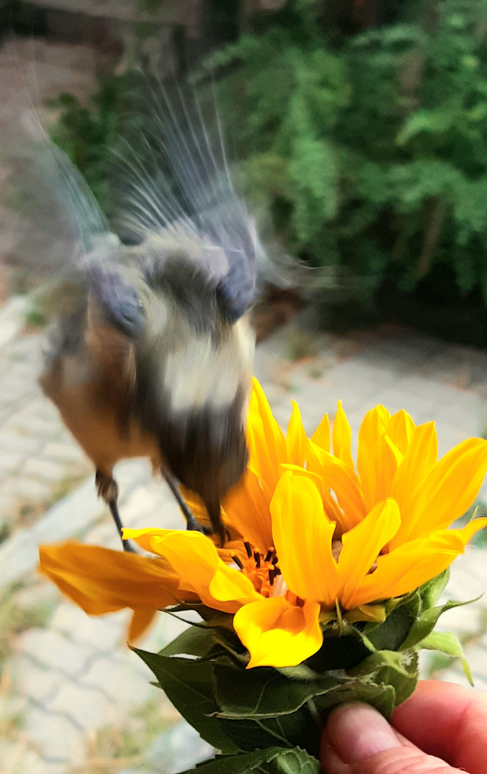 С каким любопытством синичка изучает неведомое крылатое существо...