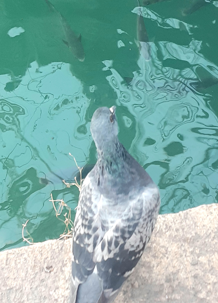 Две цивилизации мирно смотрят друг на друга с фотографии. Рыбы и птица не пересекаются, интересуются друг другом... и не лишают друг друга свободы со всеми вытекающими.