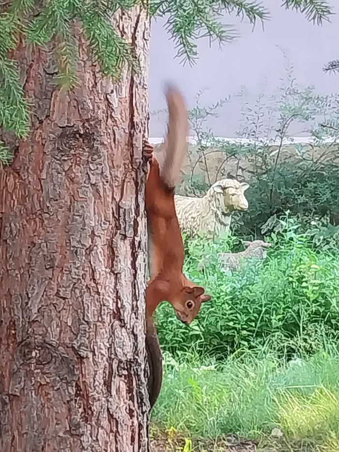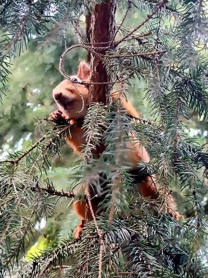 И кадр где белочка наблюдает, стоя на задних лапках и, прячась в ветвях...