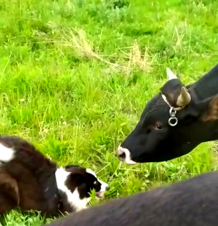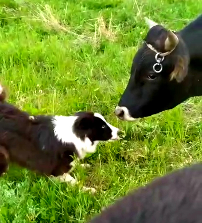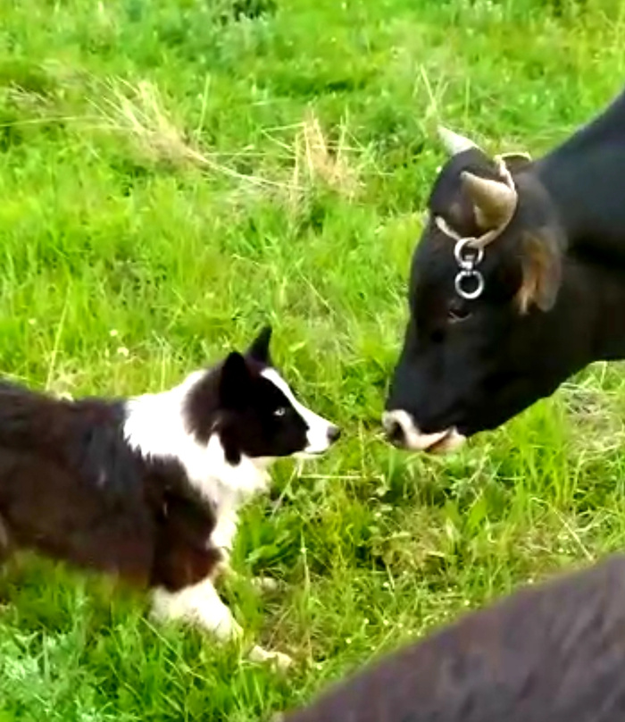 Создавала тему о потеряшке бордер-колли, прибившейся к ферме около Первоуральска. Собака не подпускала близко к себе хозяина, но по доброй воле начала пасти овец и коз. И особенно подружилась с быком.