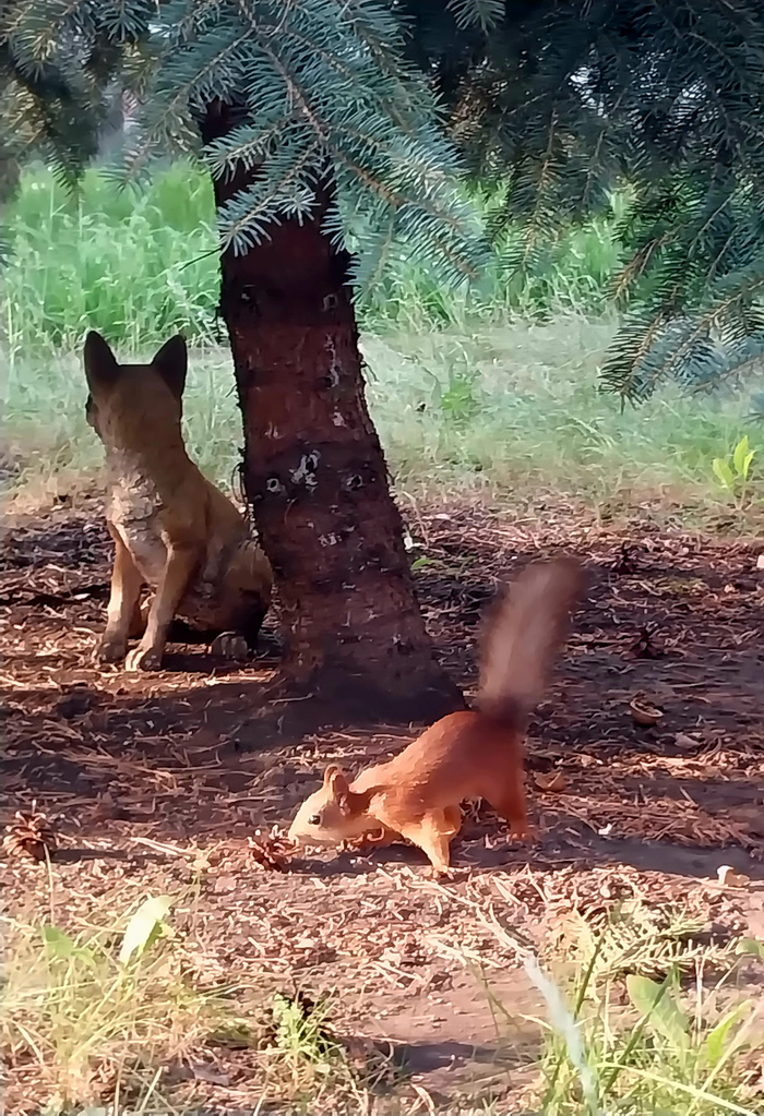 Две фотографии меховой девочки и белочки... как усиленно удерживается и отворачивается собачий ребёнок от пушистой проказницы... на второй белка провоцирует, будто заигрывает с собачкой.