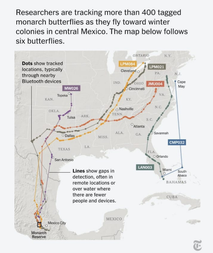 Возможно, они из разных мест слетаются после зимы в Мексику, а зимой/ осенью они или их дети возвращаются по домам.