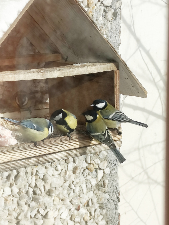в кормушке. 😁. С начала осени, пока нет снега даем чуток зернышек, в холода по-больше. Мы в прошлом году осенью спилили на участке много деревьев старых. Большие ветки рябины привязали к забору палисадника. Теперь птичкам есть где сидеть. До этого куст сирени был рядом с кормушкой и по нему