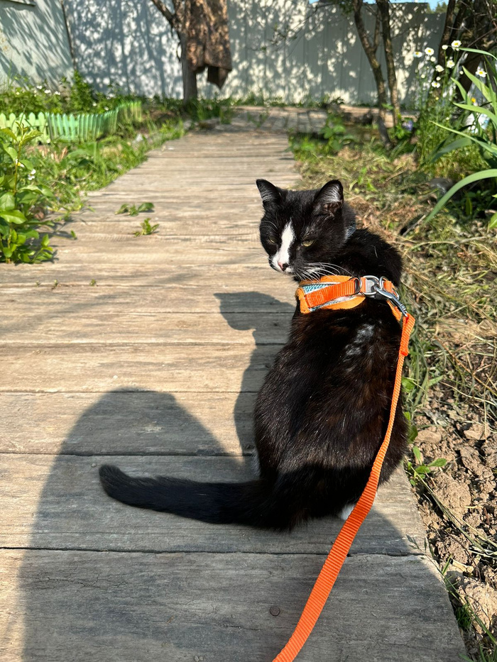 Чёрнобелую кошечку с маститом на лето определили к тёте в сад, гуляет там на шейке: