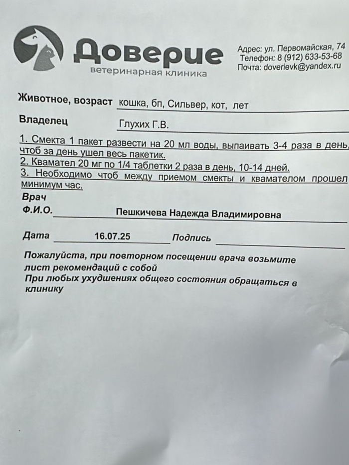 Последние несколько дней наш недавний подобрыш из общежития Сильвер стал плохо есть, блевал, стал поносить, похудел. Свозили к ветеринару, поставили противорвотный укол, сдали анализы. Отдали 2961 ₽.