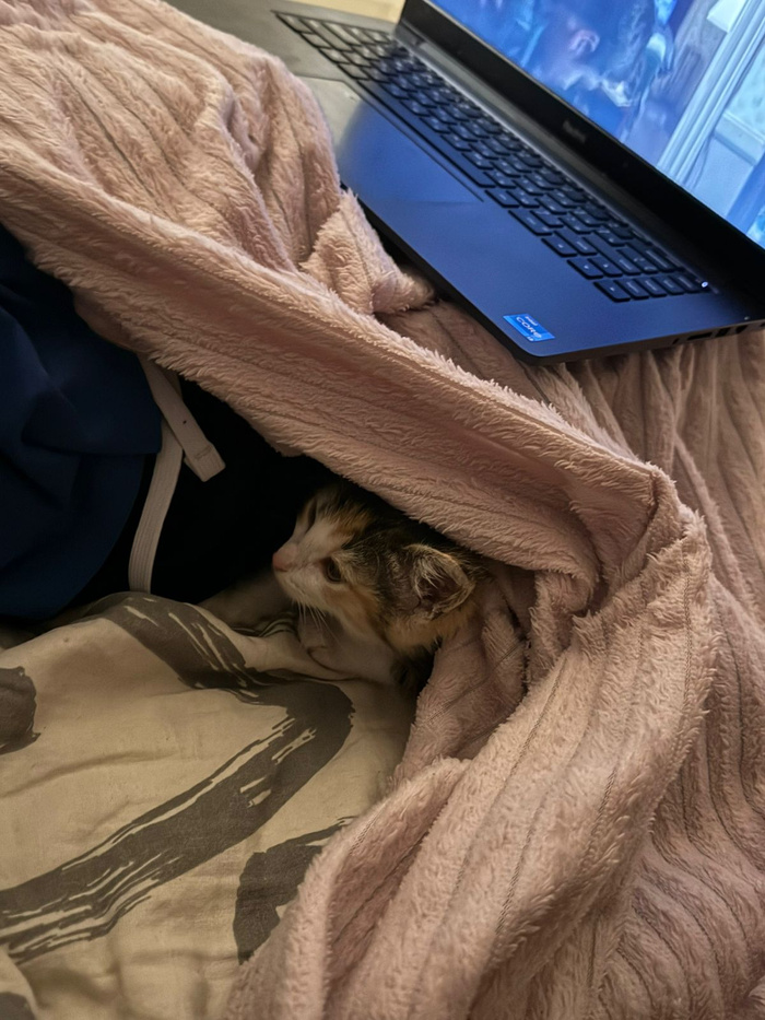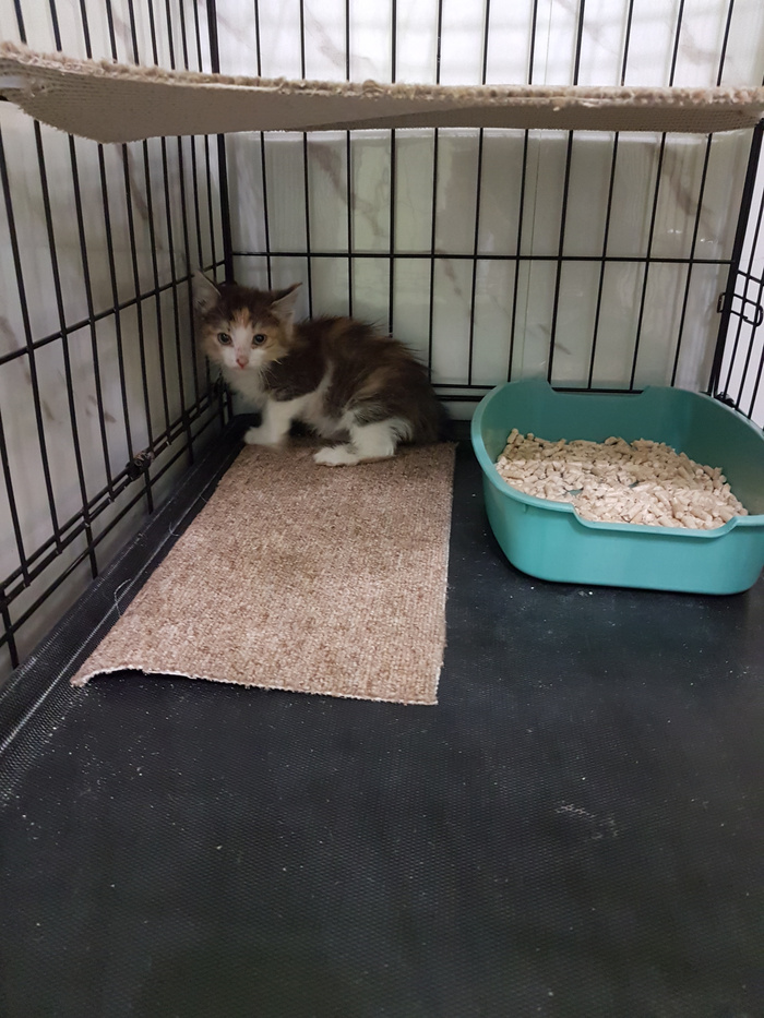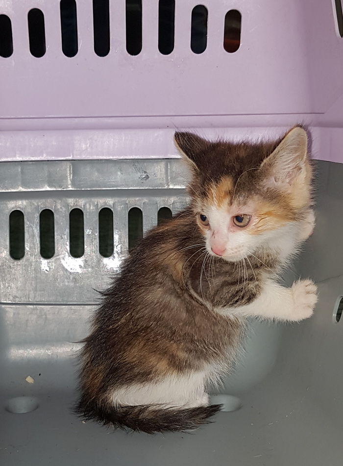 Вот такого котёнка поймала в субботу, провела через ветеринара. Отвезла на передержку "Хвостики ЖБИ". Помощь понадобится на обработки для этой малышки и второго котёнка, который ещё не пойман