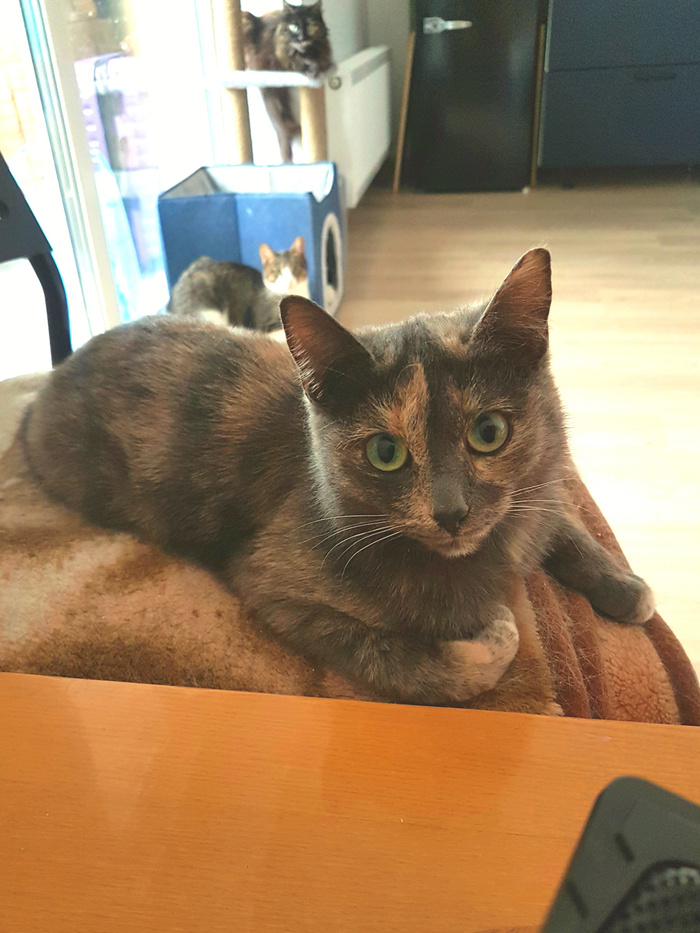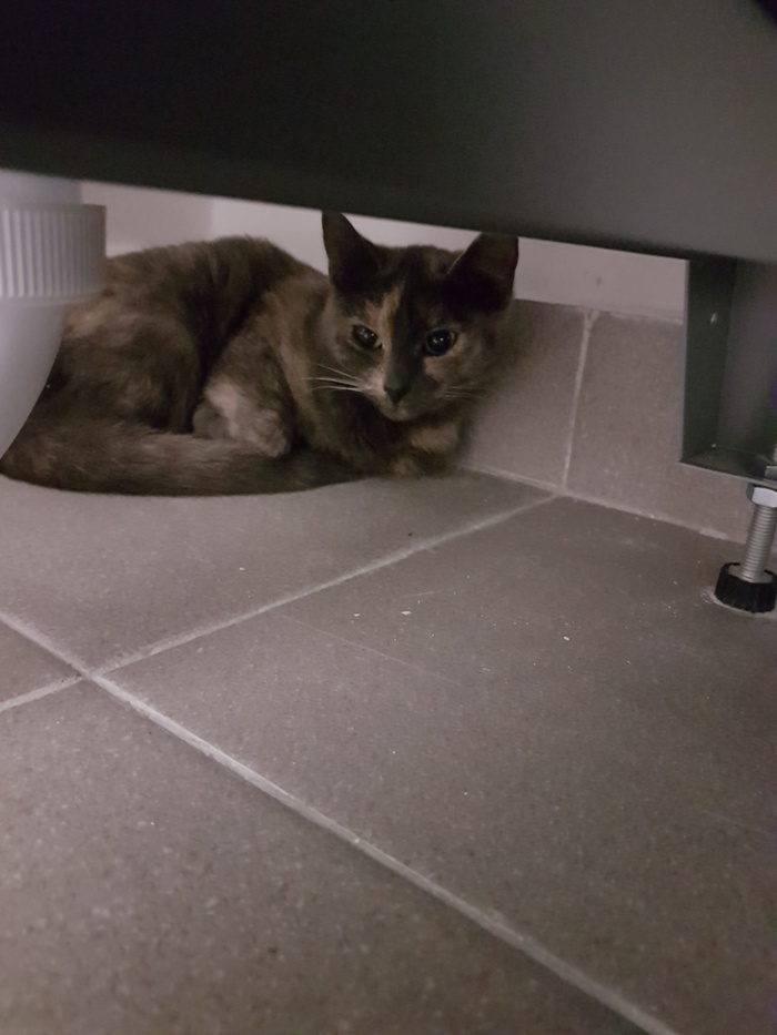 Забрала к себе такую кошечку. Жила в заброшенной сарайке вместе с рыжим пушистым, о котором писала выше. Его забрали оттуда, кошечка осталась одна. Ночи холодные, жалко её стало. Подросток ещё, ласковая. Закрыла на карантин в ванной, больше некуда. Пока стрессует, не выходит. На следующие выходные планирую стерилизацию
