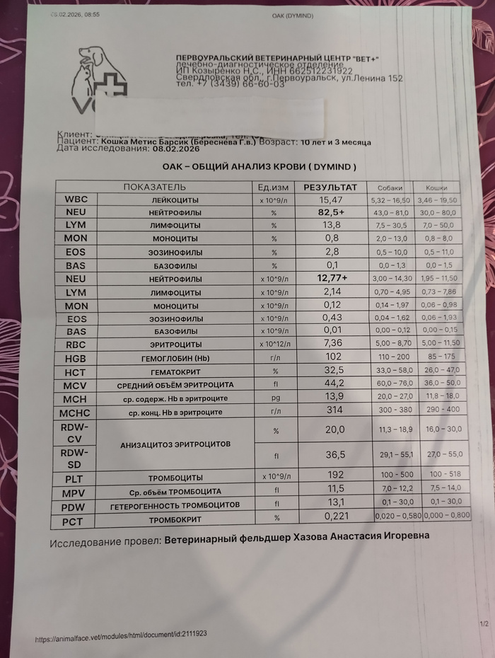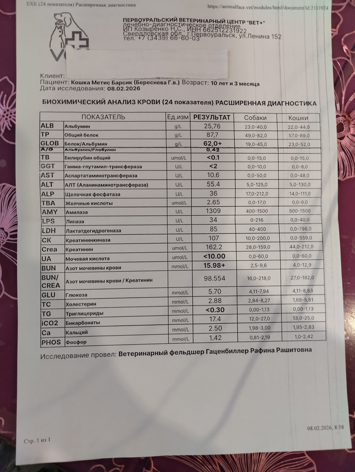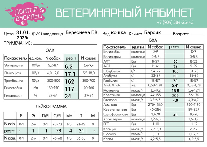 Под расписку ушла из больницы после операции 30.01. Барсика перед больницей не отправила в подвал, т.к. были сильные морозы. На кого оставляла котеек, согласились, чтобы Барсюша пока остался дома. Придя из больницы, сдала анализы, не могла его отправить в подвал т.к. оч. похудел.Ест хорошо, Т.Т.Т. Не могу выложить выписку т.к. написана в МАКСЕ. Назначили Фолиевую к- у 1/8 т 1р/д; Нефроантитокс и Ренал. И порекомендовали сдать анализы на вирусы. Пока лечимся.