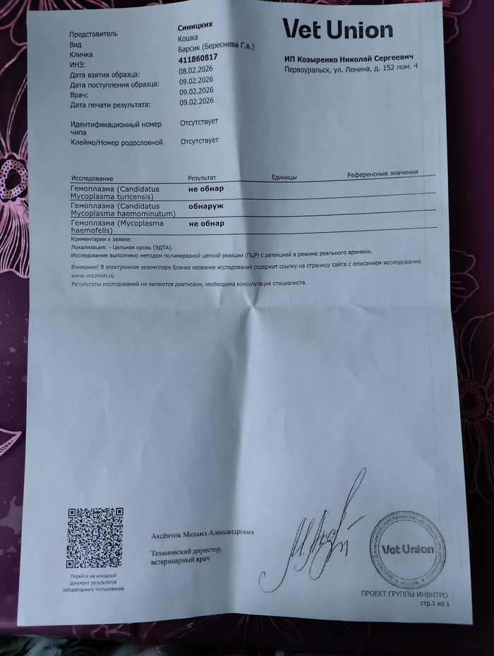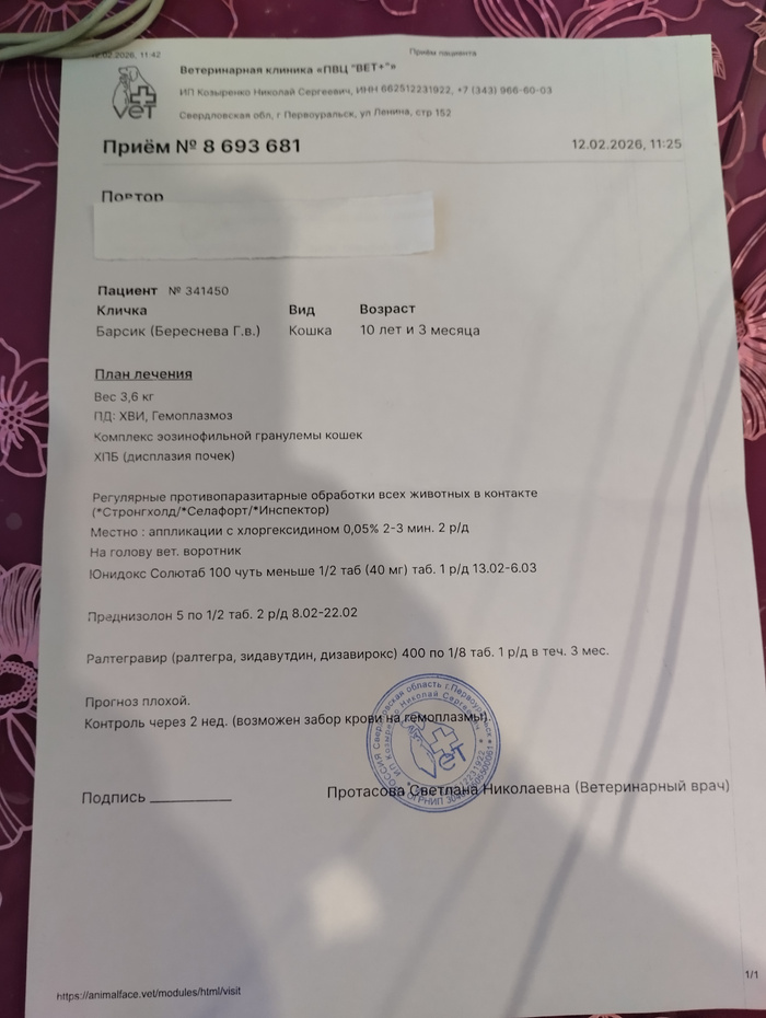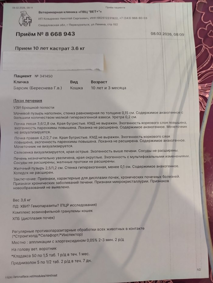 Назначение лечения исправлено( добавлено) после результатов анализов из ВетЮнион