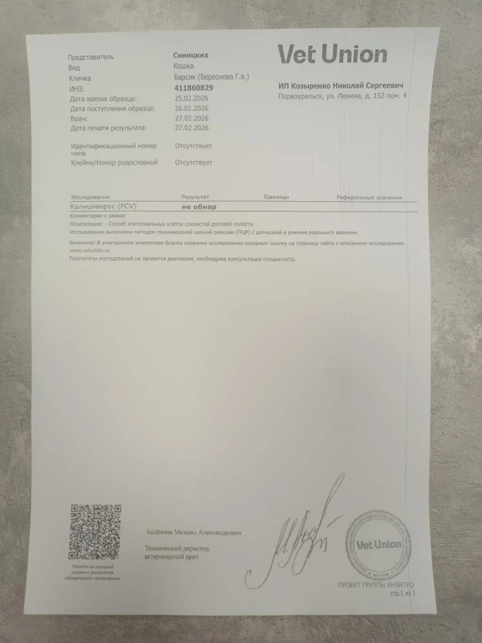 Сдали Барсюше анализ на калицивироз. Хоть этот анализ радует.