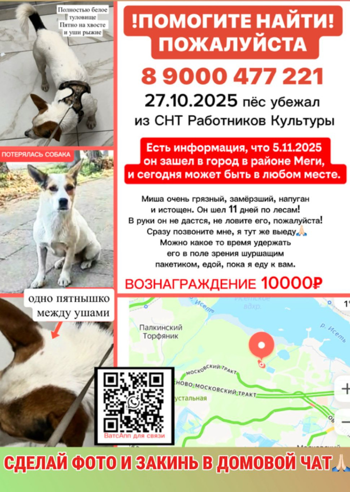 Собака-дворняга мелкого размера, примерно с джек-рассела, кобель. Кличка Джоник. Вывернулся из ошейника 2 ноября, испугавшись петарды, и убежал. Заблудился (иначе вернулся бы уже в свой двор), бегает уже 4 дня, гладкошерстный, совсем без подшерстка, скоро погибнет. Собака трусливая, к людям и другим собакам не подойдет, даже за едой. Сейчас может быть где угодно, скорее всего все время бежит, потому что лечь на землю для него равно замерзнуть, а в помещение зайти побоится. Хозяин готов приехать искать его по любой наводке. Пожалуйста, если вы увидели эту собаку, живую или мертвую, позвоните! Хотя бы понять направление движения, в какую сторону он бежит...