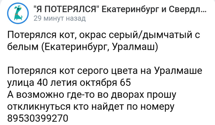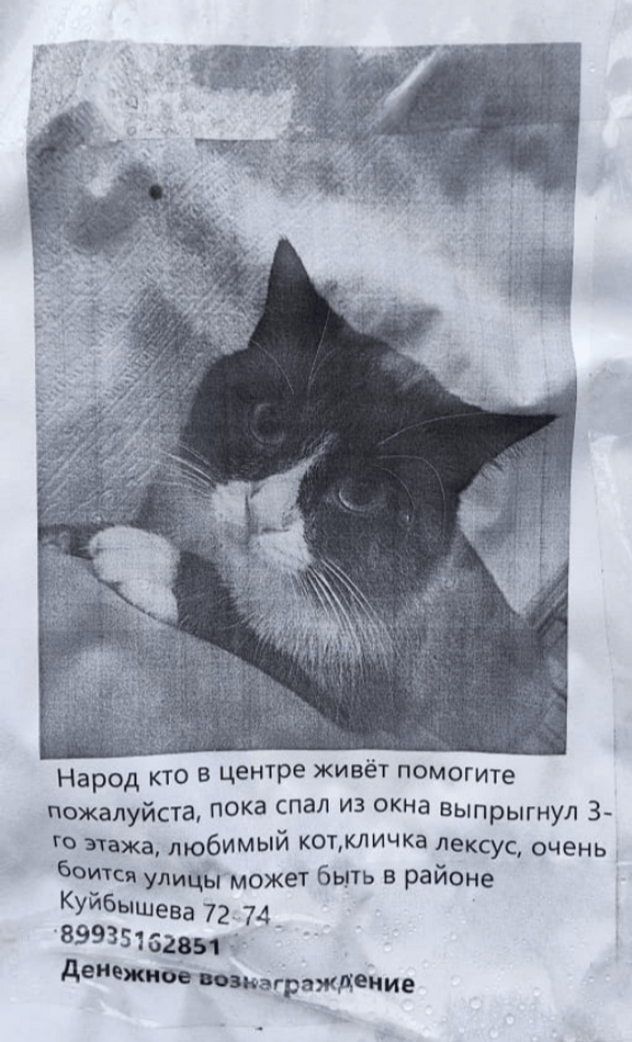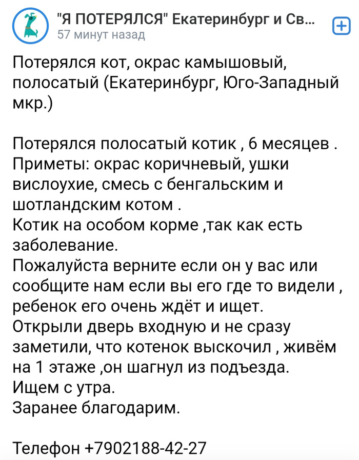 Если кто-то видел его или приютил, либо вы заметили, что он сел к вам на окно или балкон, пожалуйста, не прогоняйте, просим сообщить по номерам телефонов: