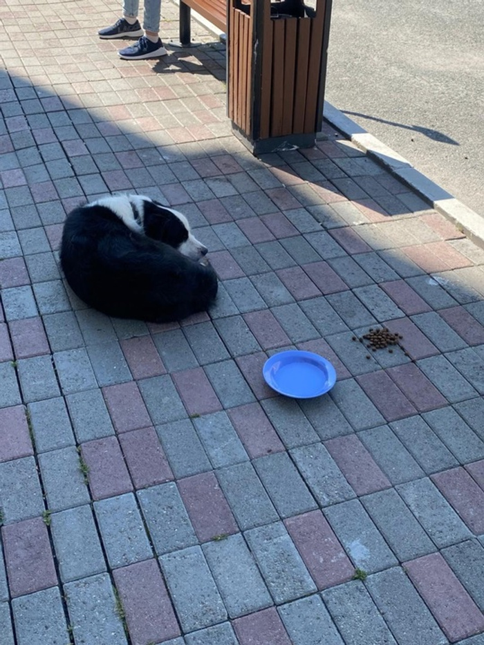 Чья потеряшка? Собачка уже в возрасте с ошейником лежит возле делового квартала.
