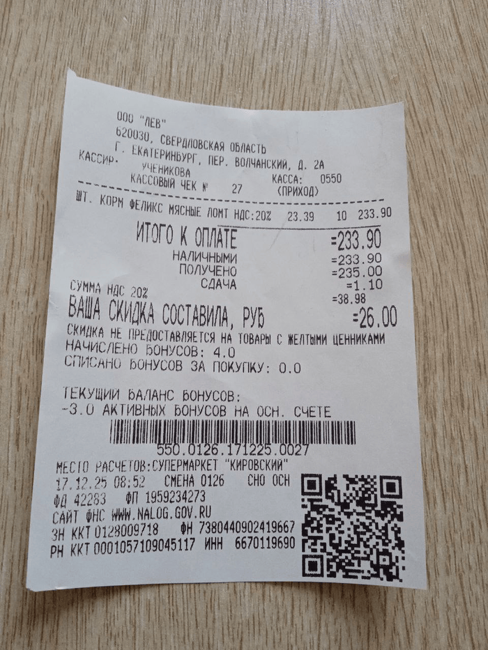234 руб (корм, чек пост от 29.12.25)