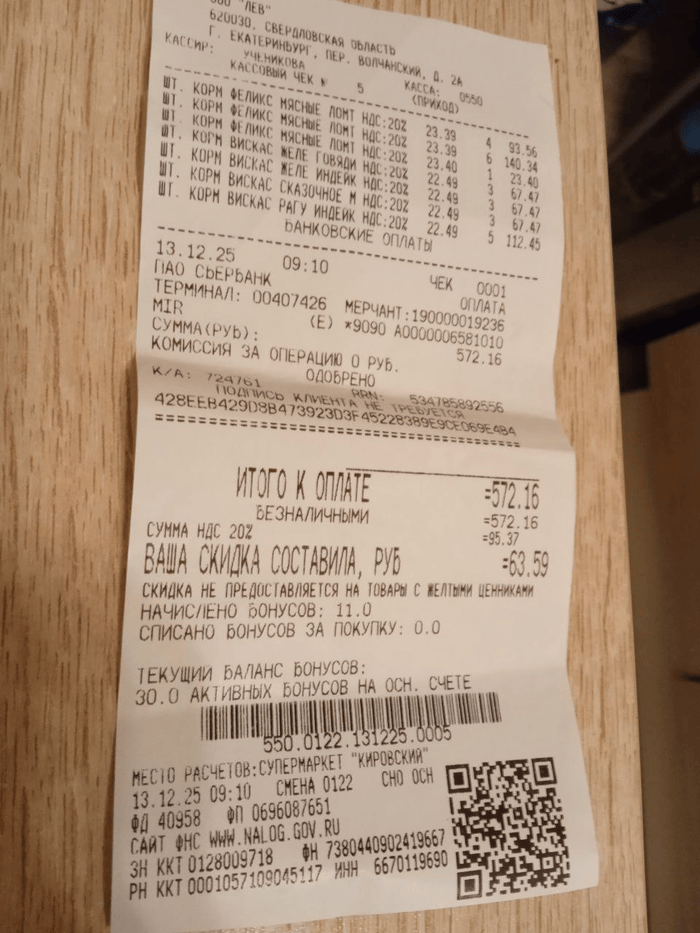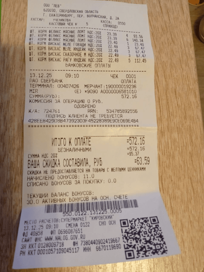 572 руб (корм, чек пост от 29.12.25)