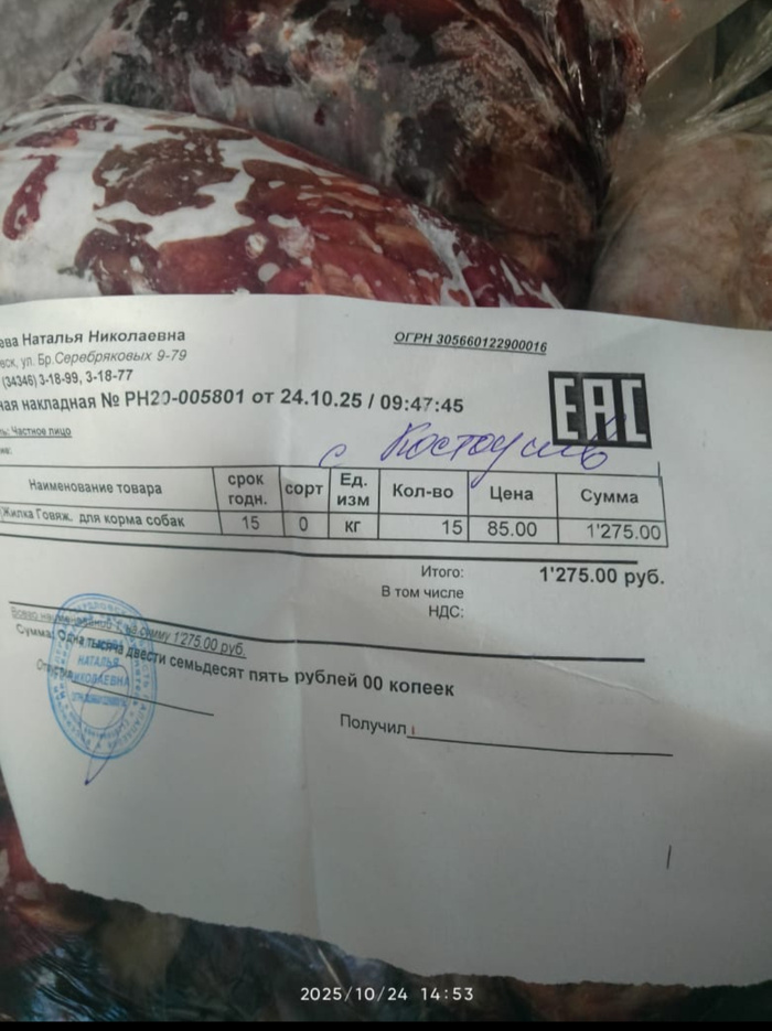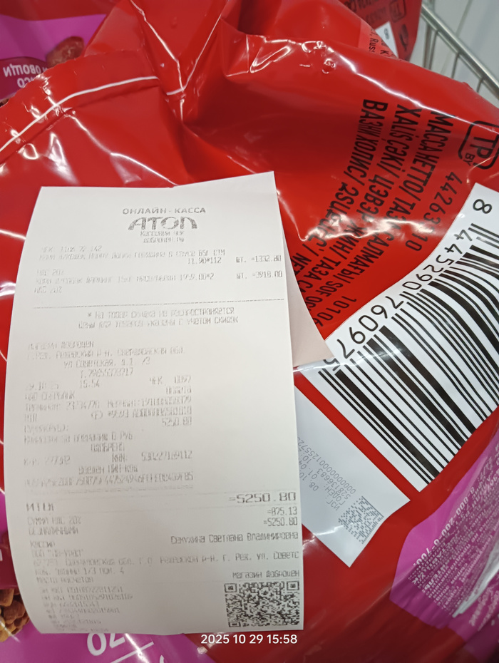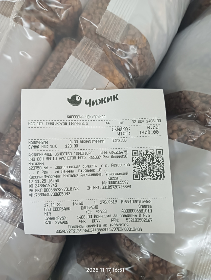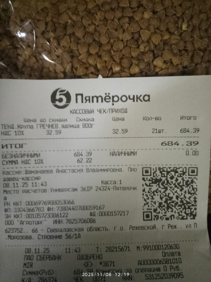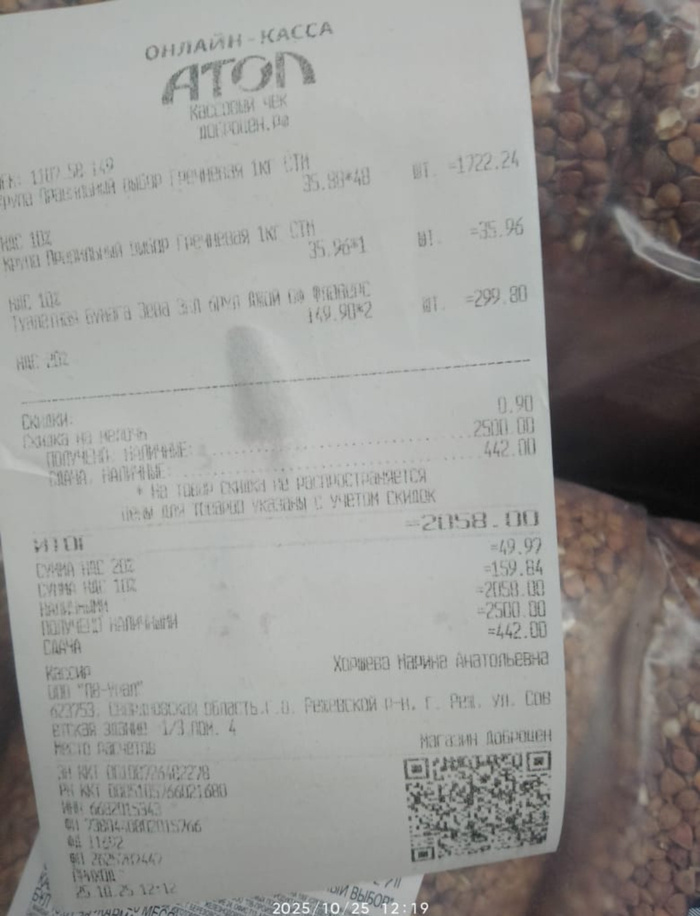 Чек на покупку гречневой крупы для собачек