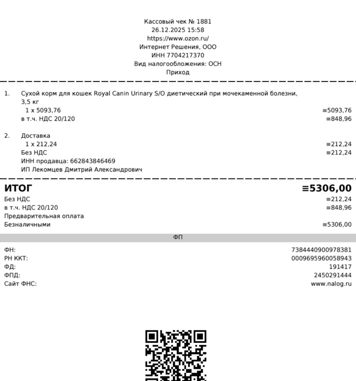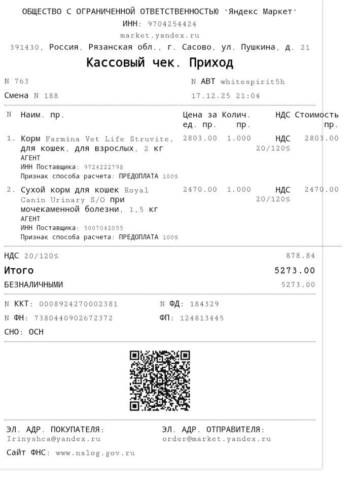 Чек на покупку корма для собак и кошек