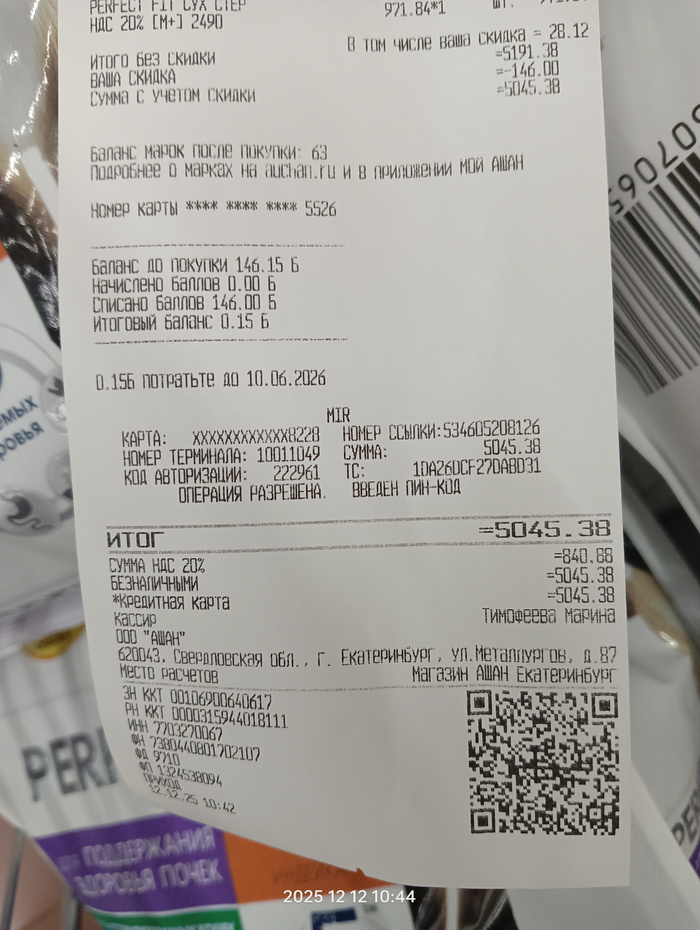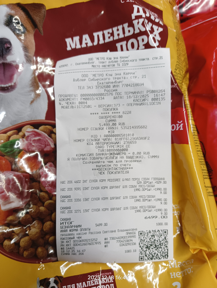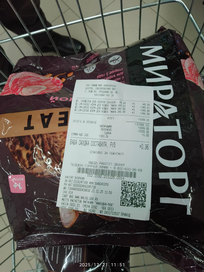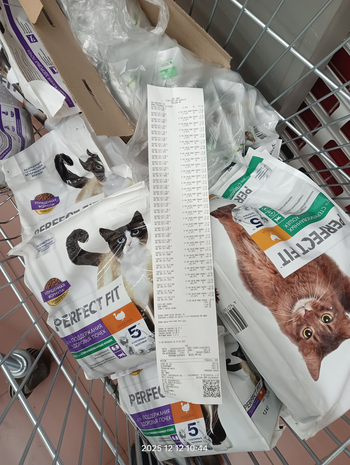 Чек на покупку корма для кошек и лёгких для собак