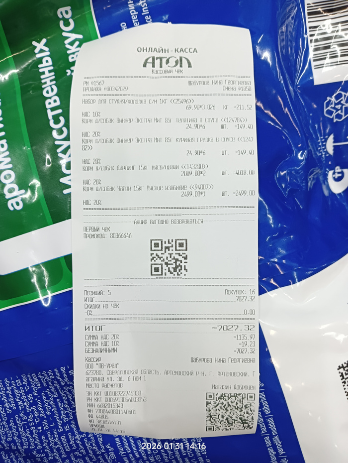 Чек на оплату корма для собак и паучи для болеющего Персея