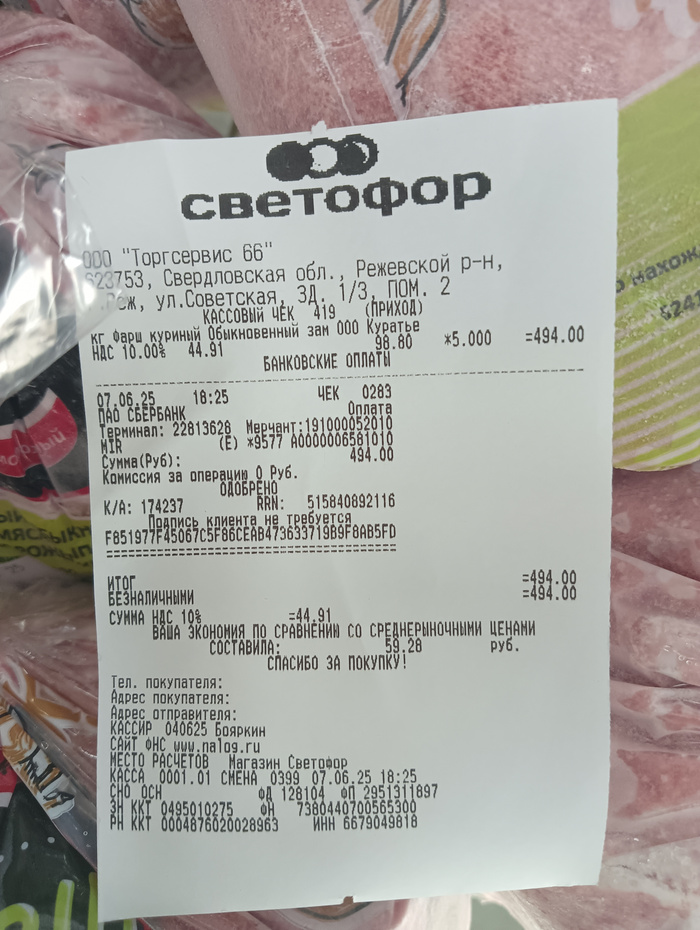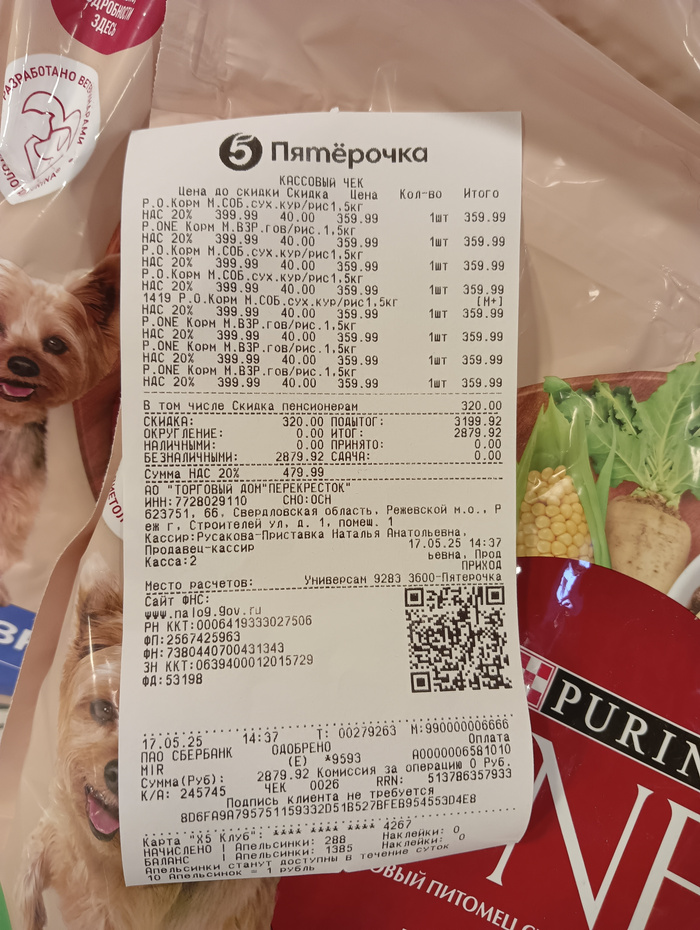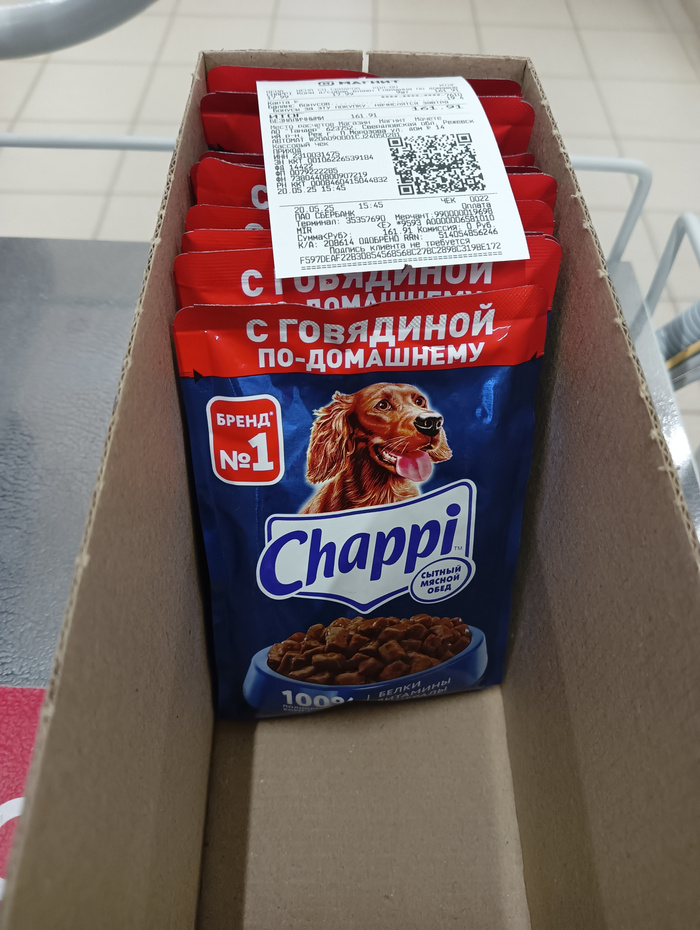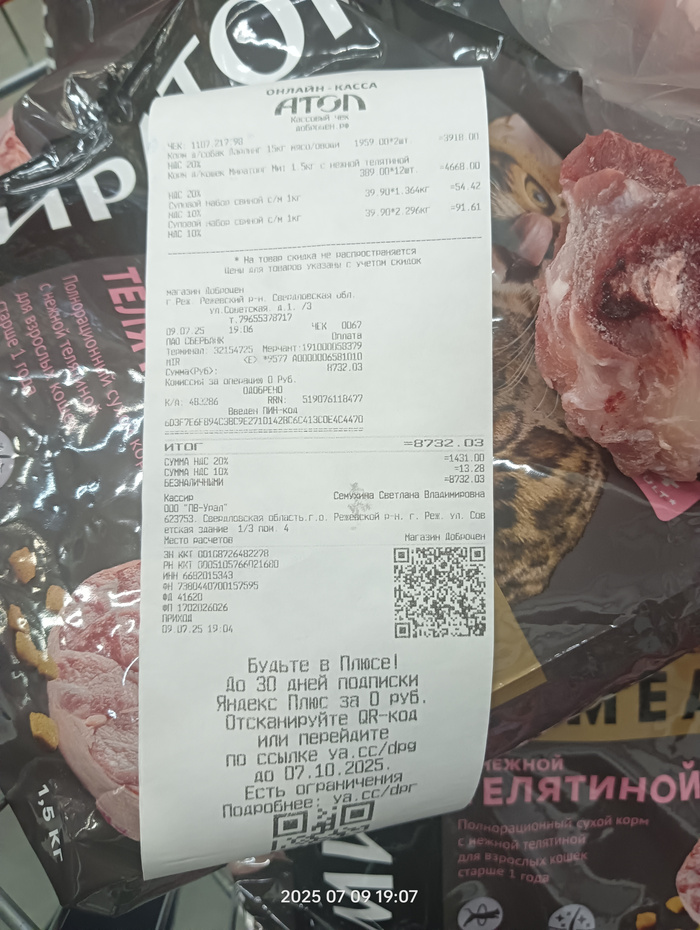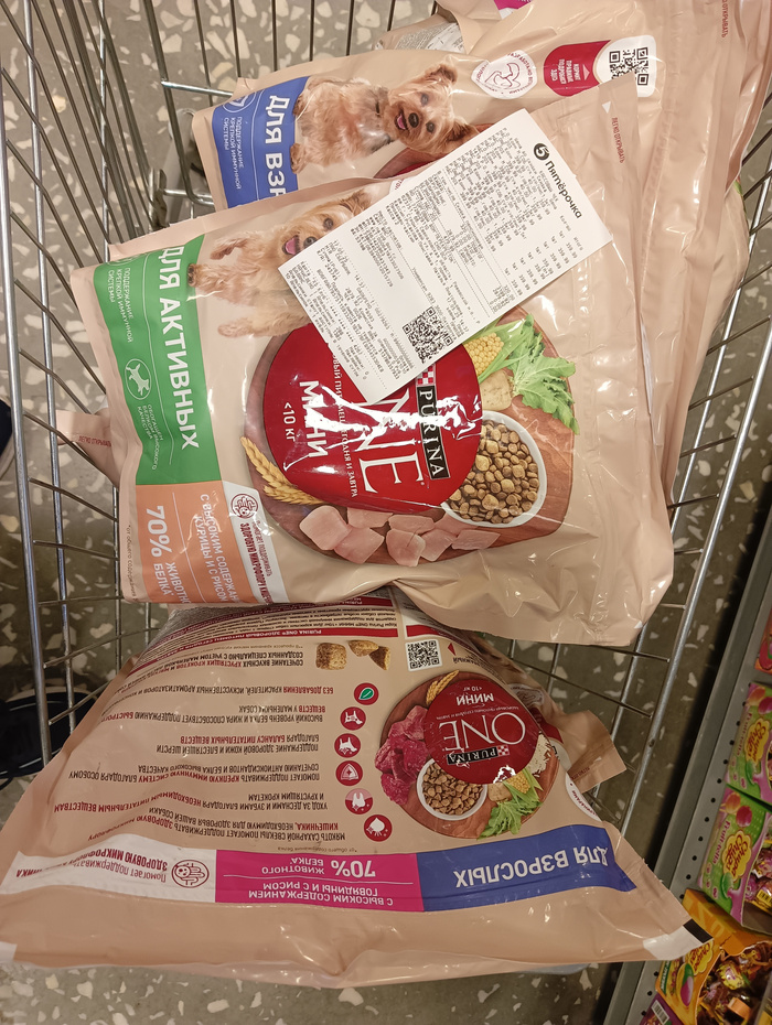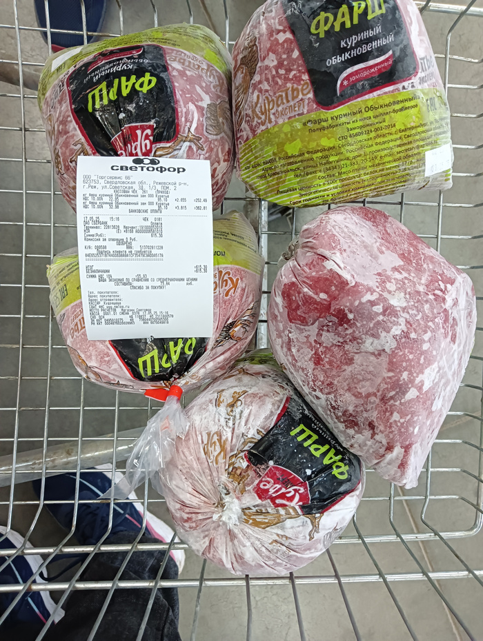 Чек на покупку корма, гречи, батонов и фарша