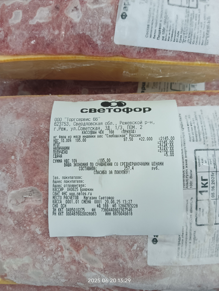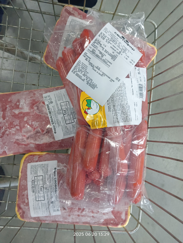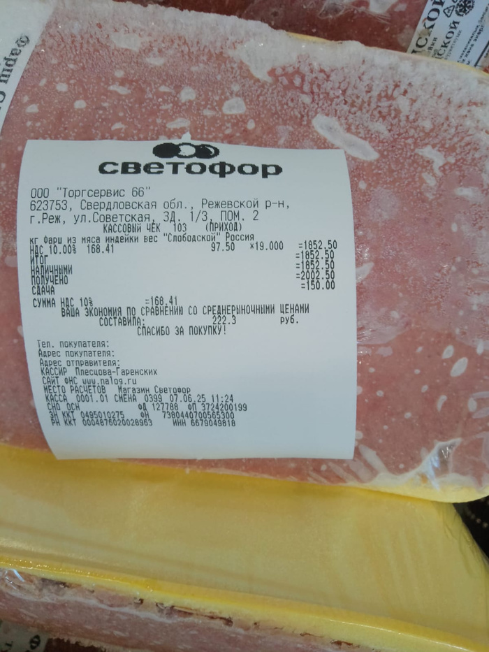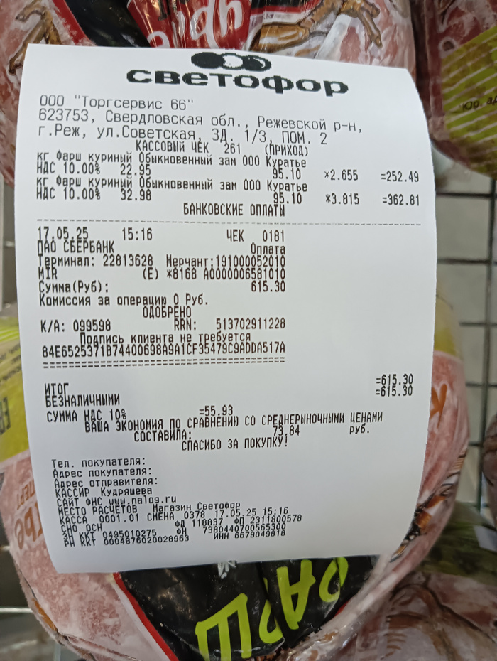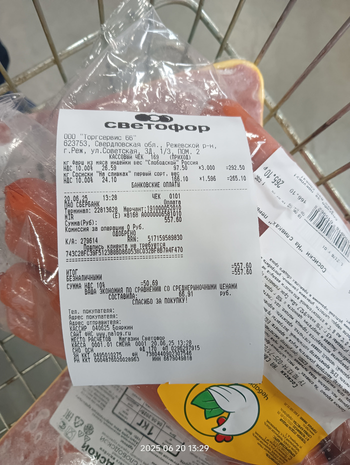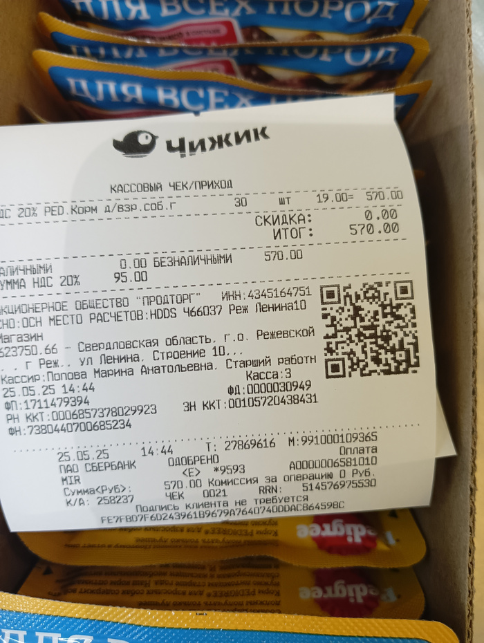 Чек на покупку корма, гречи, батонов и фарша
