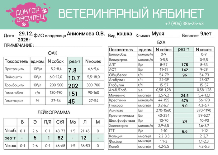 Придурочная, дикошарая Муся с кривым ухом, хуже стала кушать, свозила ее на анализы, результат - шок. Почемууу, 9 лет кошке, я ее спасла в саду подростком диким. Что делаааать, есть уже сегодня вечером совсем отказалась, накормить силой ее не получится, смотреть, как она от голода умирает.