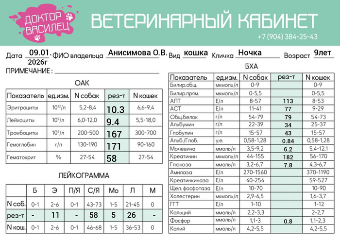 Ольга, посмотрела анализы Муси. У нее не измерялись кальций и фосфор в крови. В следующий раз, когда будете сдавать биохимию, попросите добавить в анализ калий, кальций и фосфор. Это критично для оценки состояния и назначения терапии.