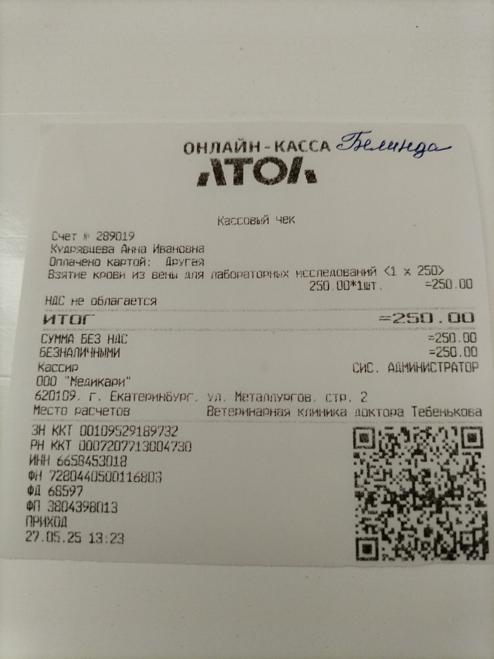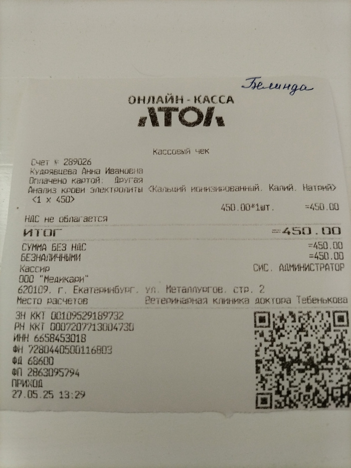 Это остаток суммы (аванс) за операцию Белочки (Белинды), которая прошла ещё 24 марта. С огромным трудом спустя почти 2 месяца, в рассрочку, удалось закрыть этот долг.