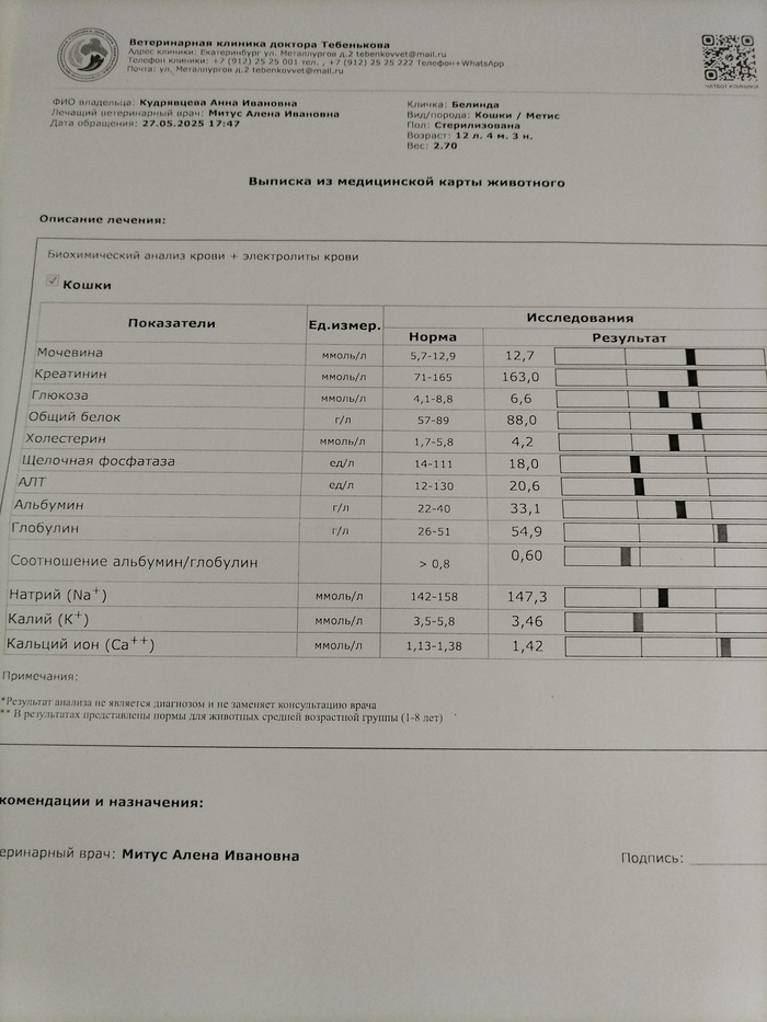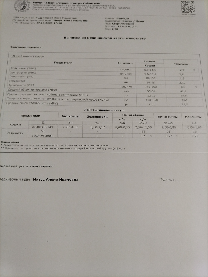 По анализам от 27 мая у кисоньки не очень хороший ОАК (низкие лейкоциты, тромбоциты), высоковат ионизированный Са.