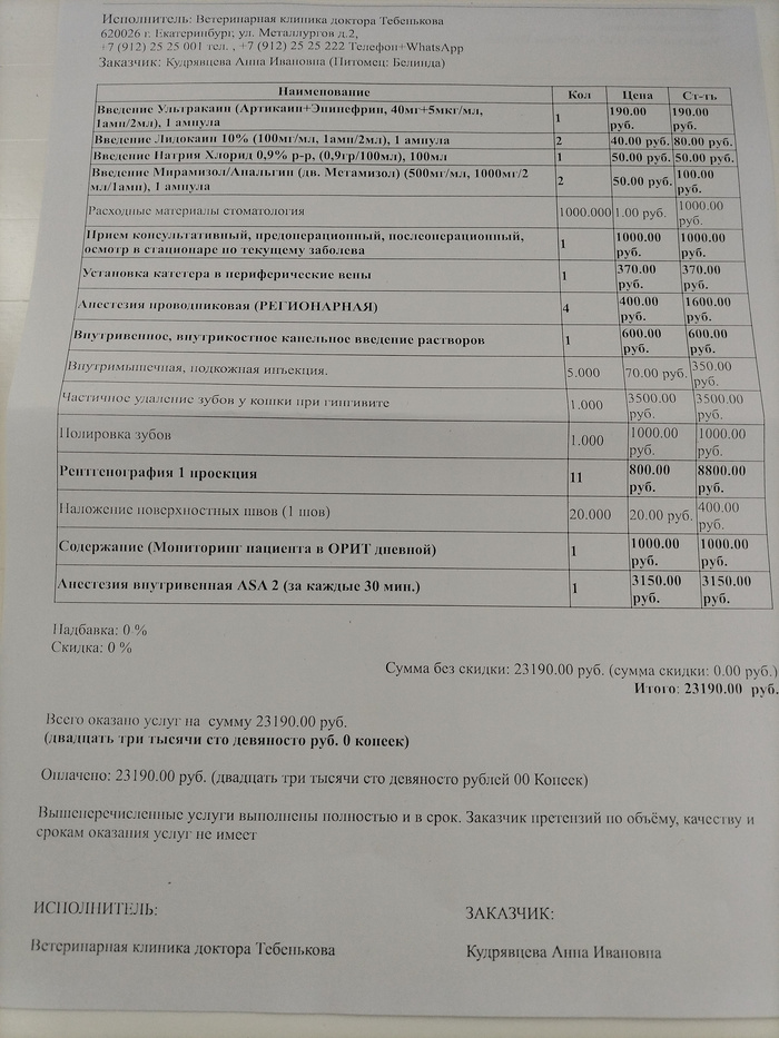 Чек от 30.04 на сумму 3190 руб. (аванс) в счет погашения долга за операцию Белочки (Белинды), прошедшую 24 марта.