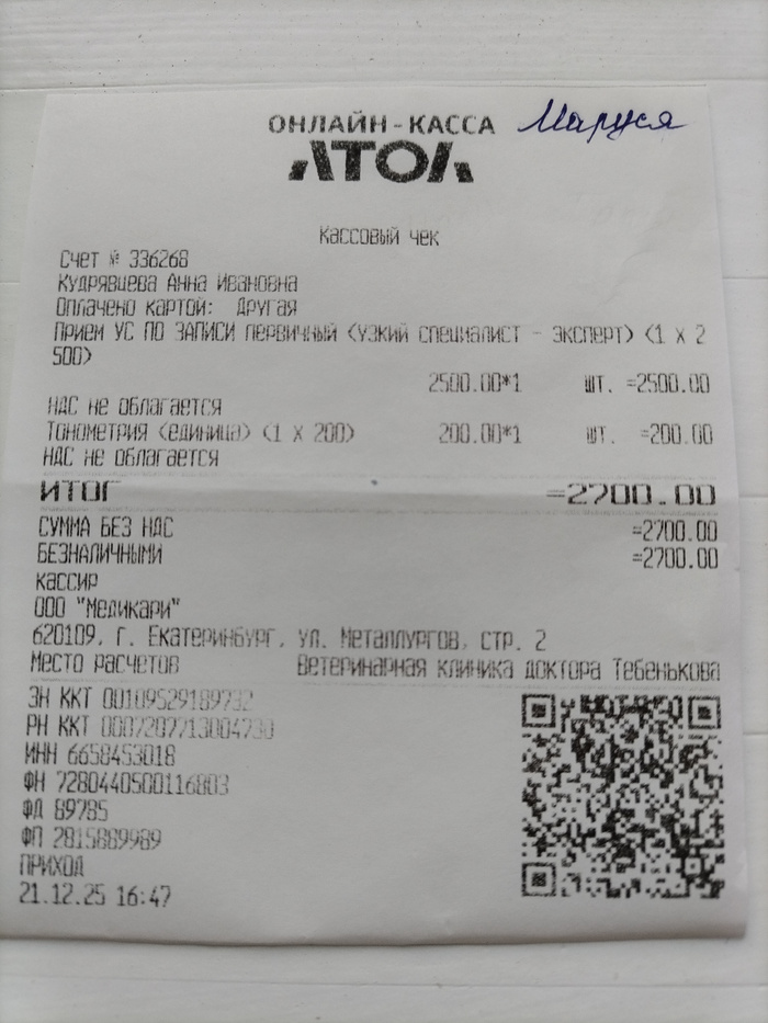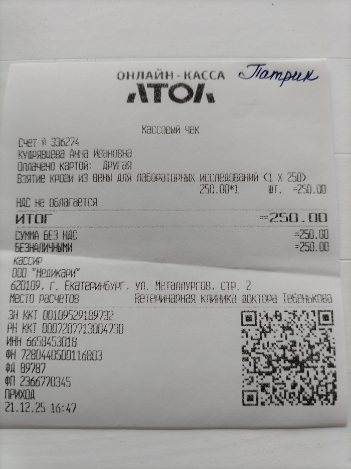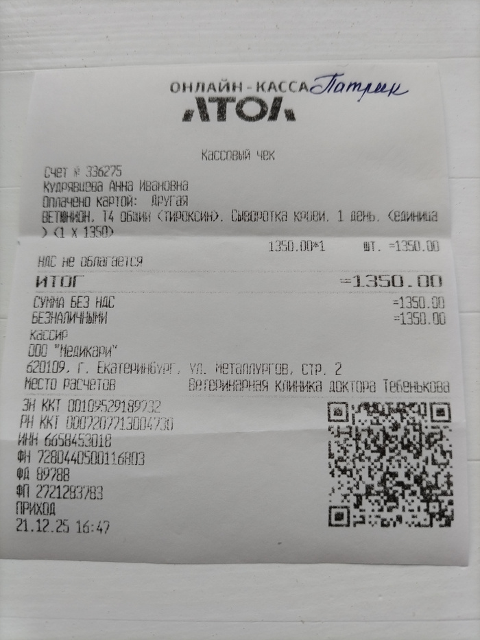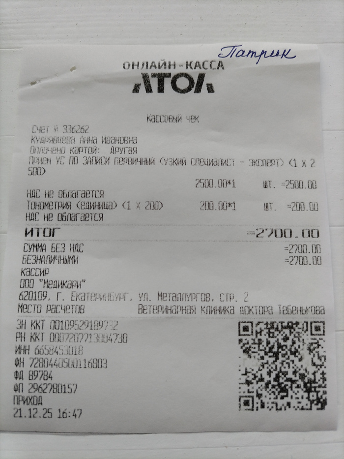 Чеки по Патрику за 21 декабря на сумму 4 300 руб. (прием гастроэнтеролога, тонометрия, анализ Т4, взятие крови)